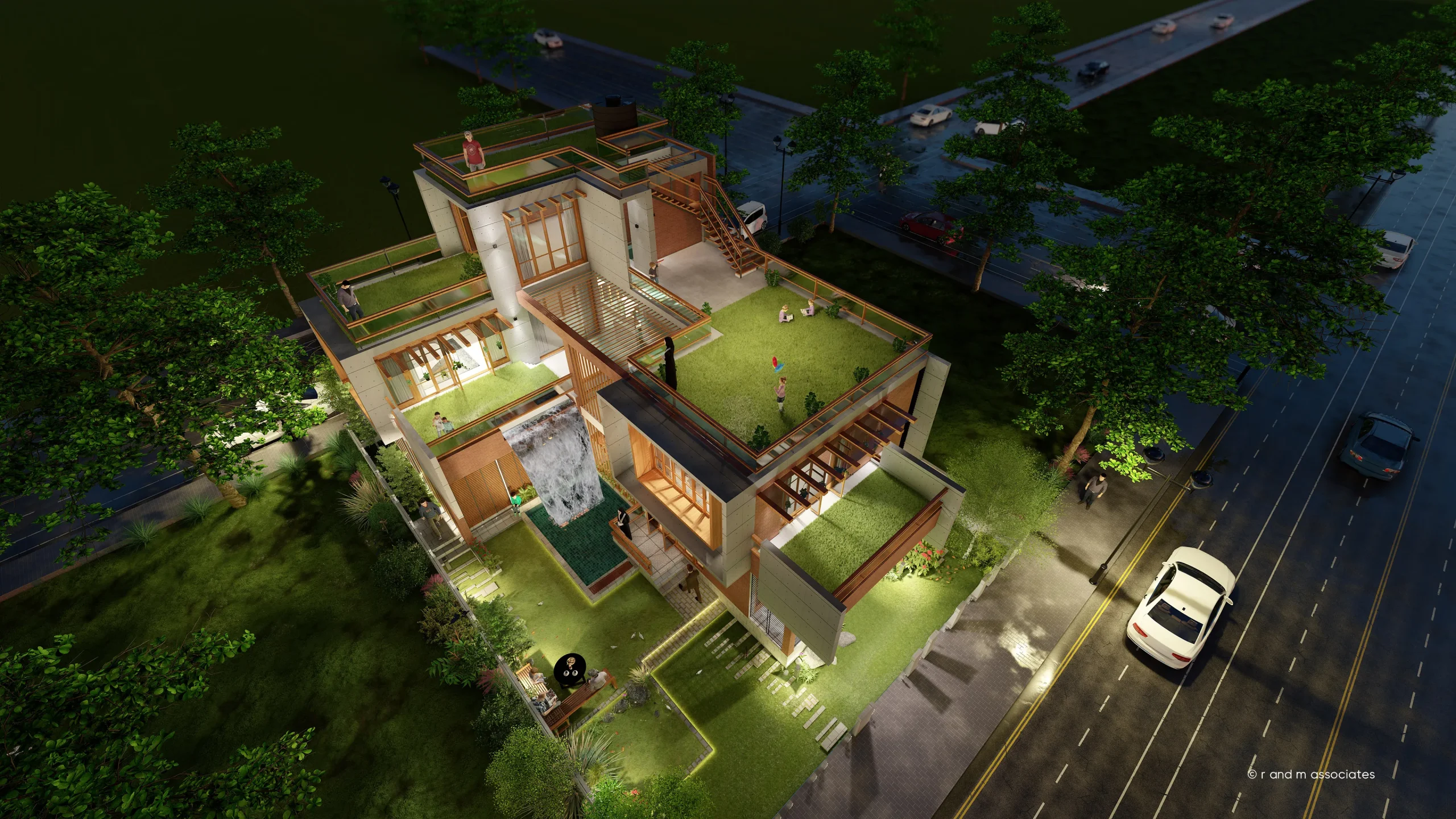 This triplex residence in Jolshiri Abason, Sector 8, is conceived as a layered garden house that dissolves the boundary between built form and landscape. The mass is generated through interlocking rectilinear volumes, shifted and recessed to create terraces, green roofs, and double-height voids. A central water feature and vertical circulation core organize the spatial hierarchy, enhancing cross-ventilation and visual connectivity. The exterior façade combines exposed concrete textures, warm wooden screens, and extensive glazing, producing a balanced dialogue between solidity and transparency. Pergolas and horizontal projections add depth while controlling sunlight. Aesthetically, the building embodies contemporary tropical architecture, where greenery, water, and light integrate seamlessly to create a serene yet dynamic residential environment.