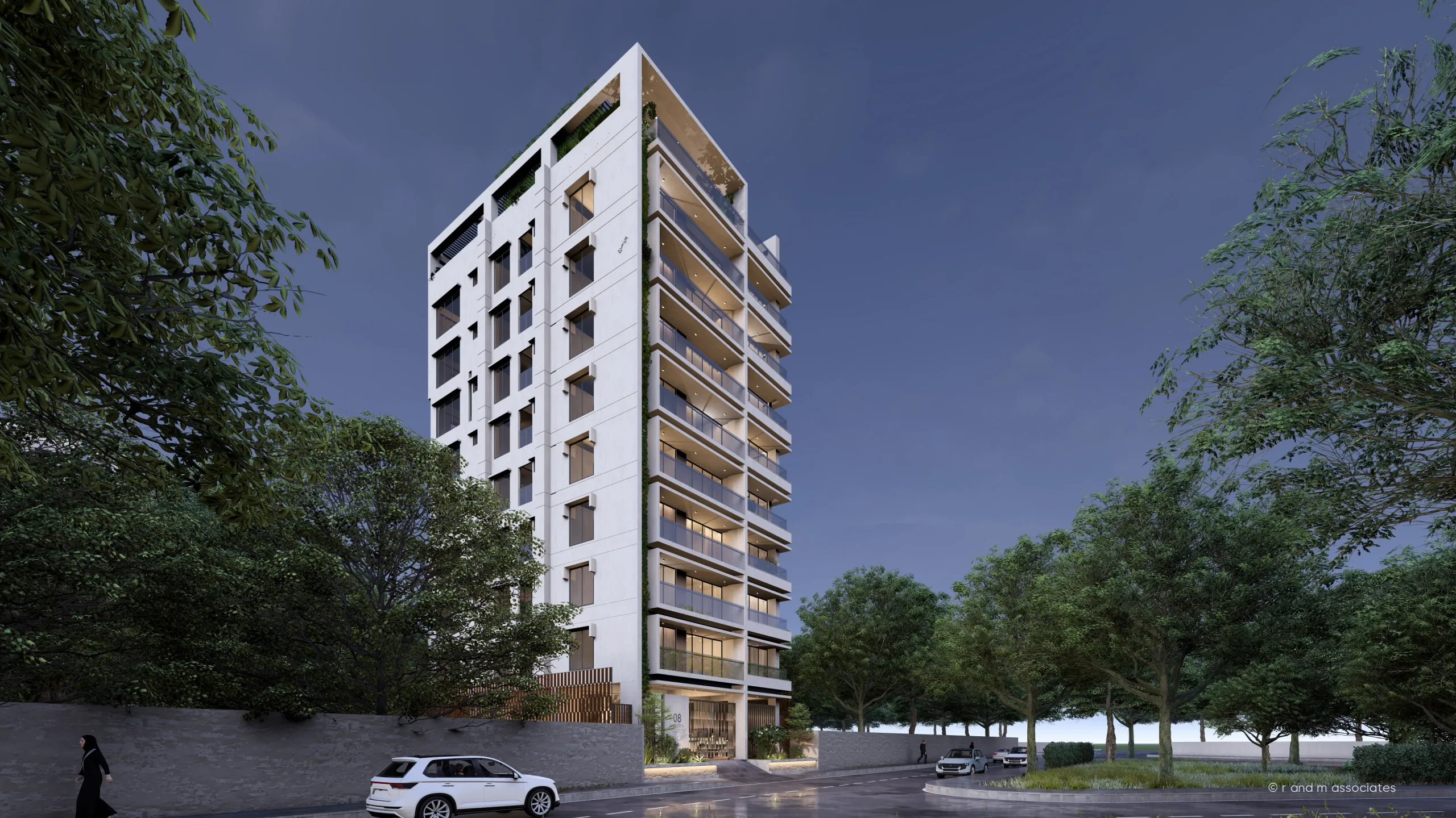 This residential project in Jolshiri Abason, Dhaka is conceived as a calm, contemporary living tower that responds to its green, low-density context. The architectural concept emphasizes vertical elegance and openness, with the form generated through a clear stacked geometry articulated by deep horizontal balconies. These projecting slabs create rhythm, shade, and a strong sense of depth while maximizing outdoor living for each unit. The exterior façade design blends clean white frames with warm-toned soffits and transparent glass railings, achieving a balance between solidity and lightness. Vertical green elements subtly soften the mass and connect the building visually to its landscaped surroundings. Overall, the aesthetic is modern, refined, and serene, reflecting an urban lifestyle closely tied to nature.
