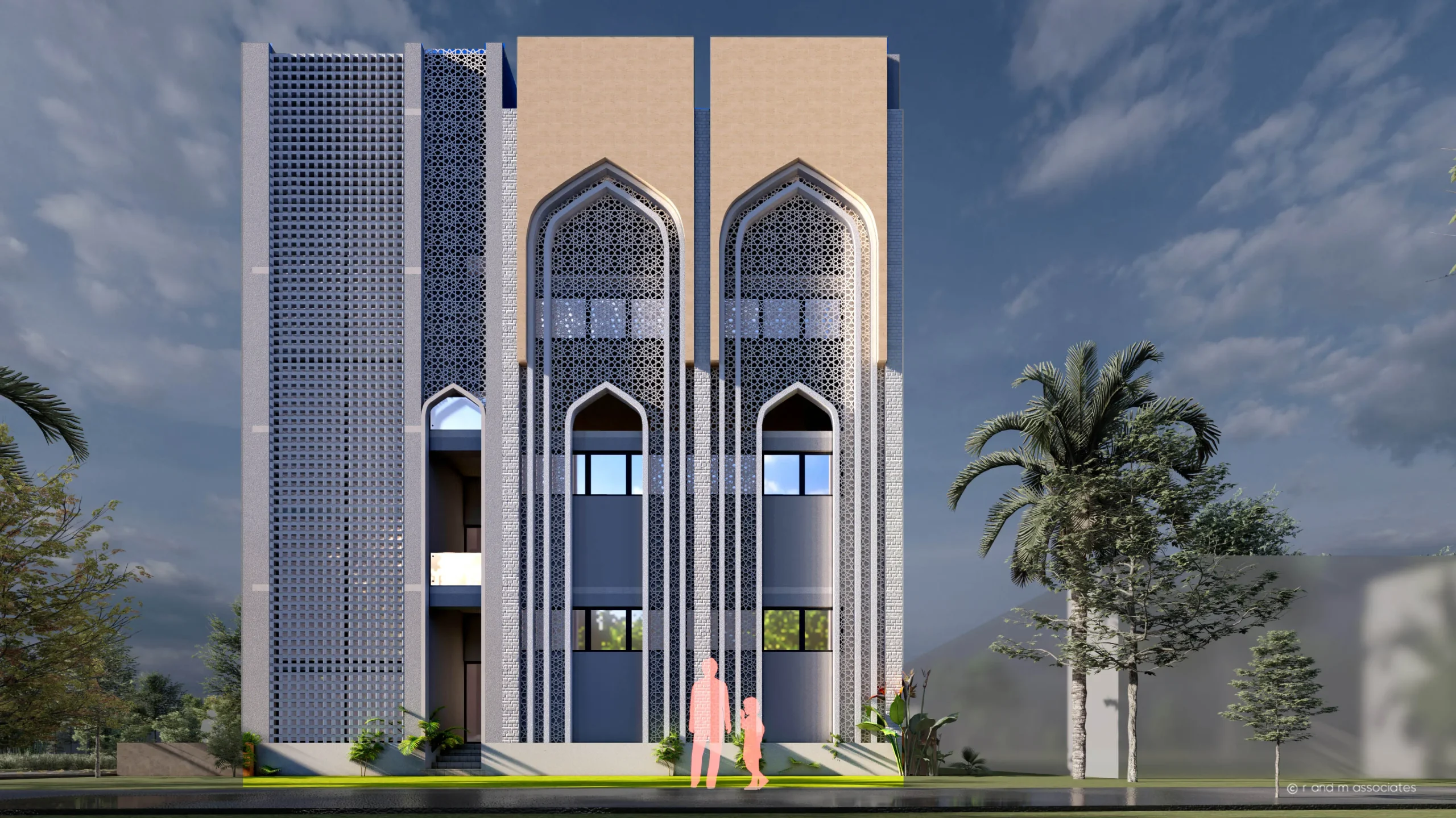 The Satir Para Jam-e-Masjid is envisioned as a contemporary religious landmark rooted in traditional Islamic architecture. The architectural concept emphasizes unity, verticality, and spiritual ascent, expressed through a strong symmetrical mass and a slender minaret rising as a visual anchor. Form generation is based on a compact, rectilinear volume articulated by repetitive arched bays that establish rhythm and order. The exterior façade is defined by perforated screens and recessed arches inspired by Islamic geometry, allowing filtered light and natural ventilation while maintaining privacy. A restrained palette of light-toned materials enhances serenity and purity. Overall, the aesthetic presents a calm, dignified, and timeless presence that resonates with its religious and community-oriented function.