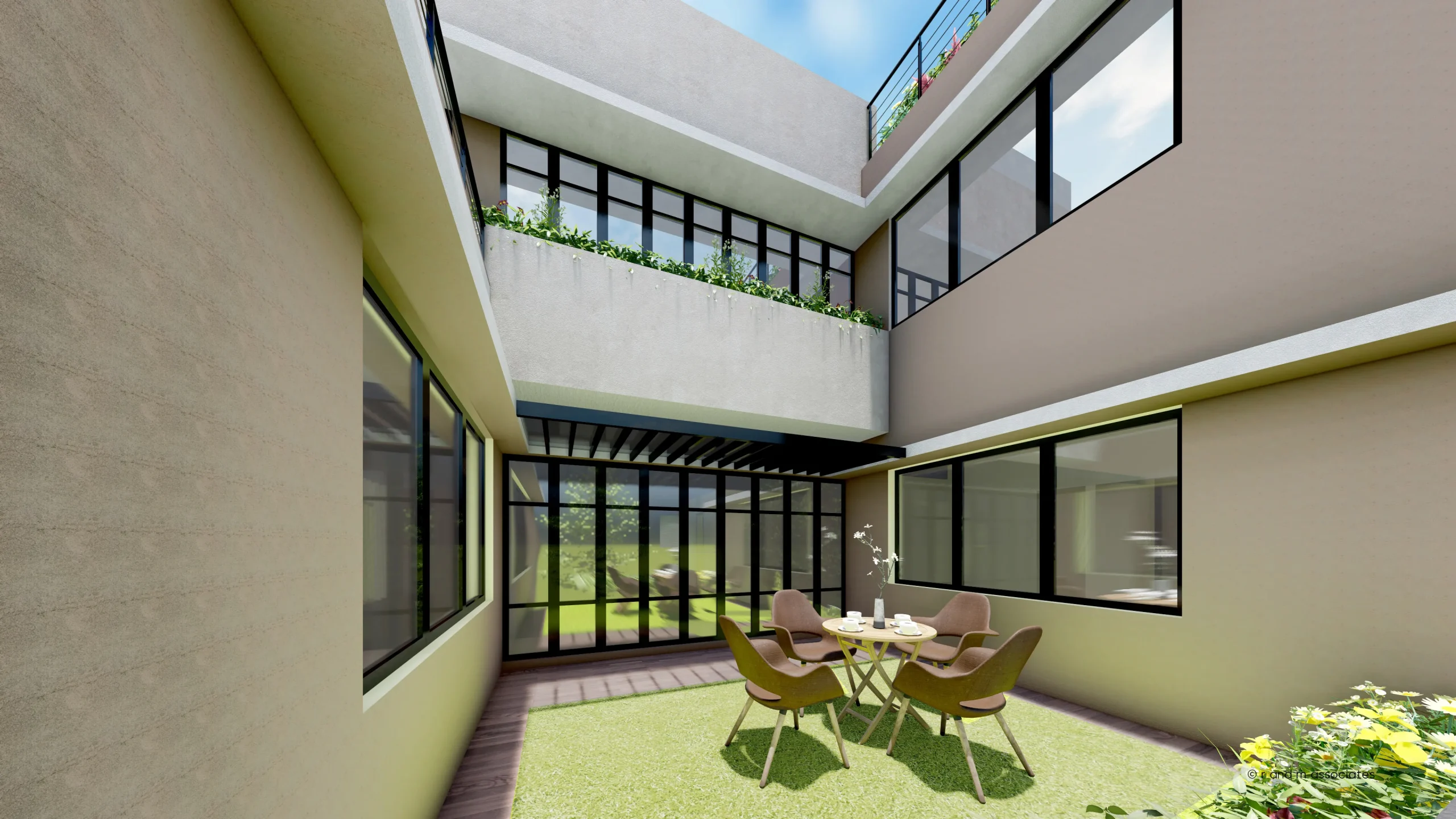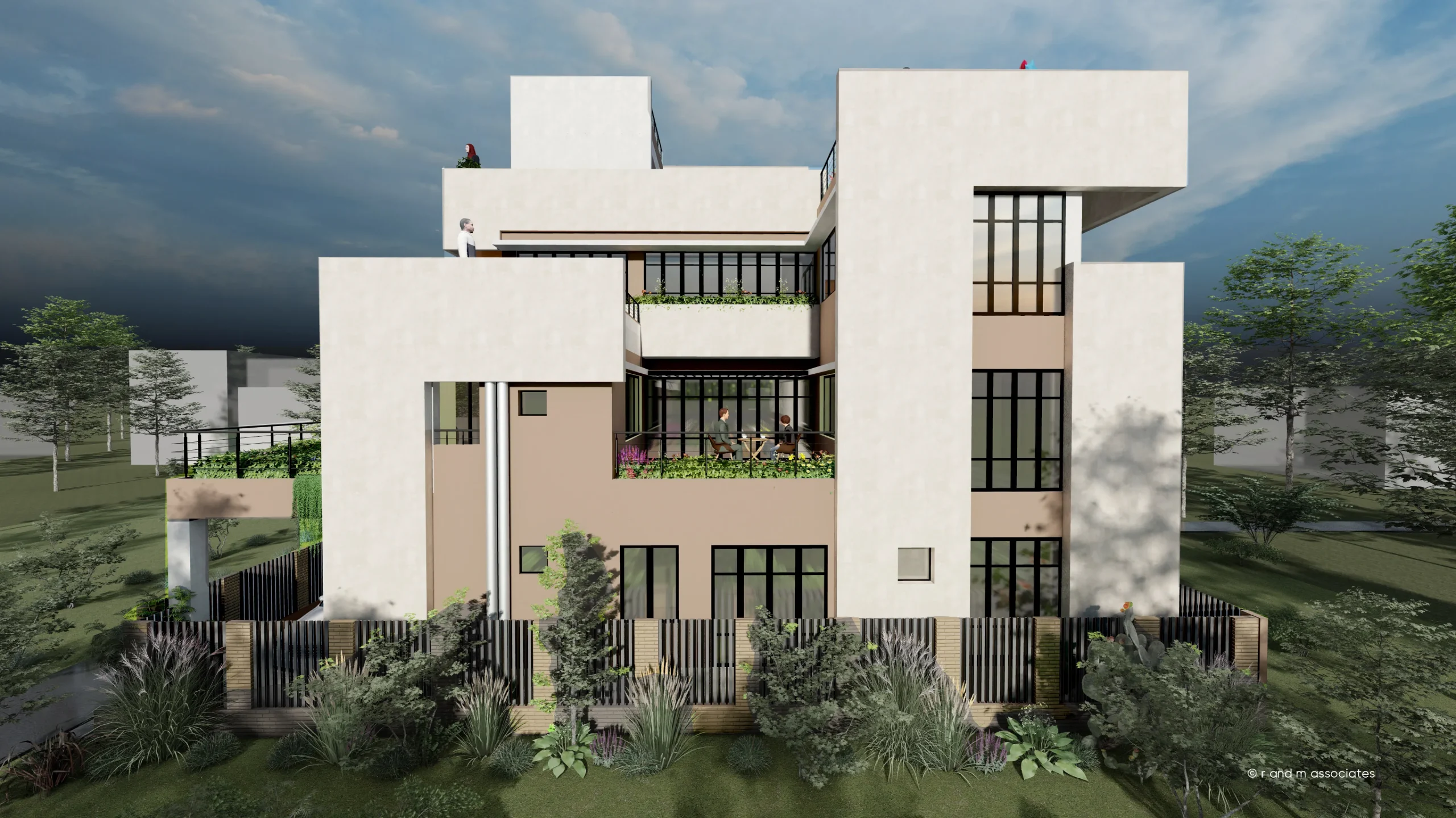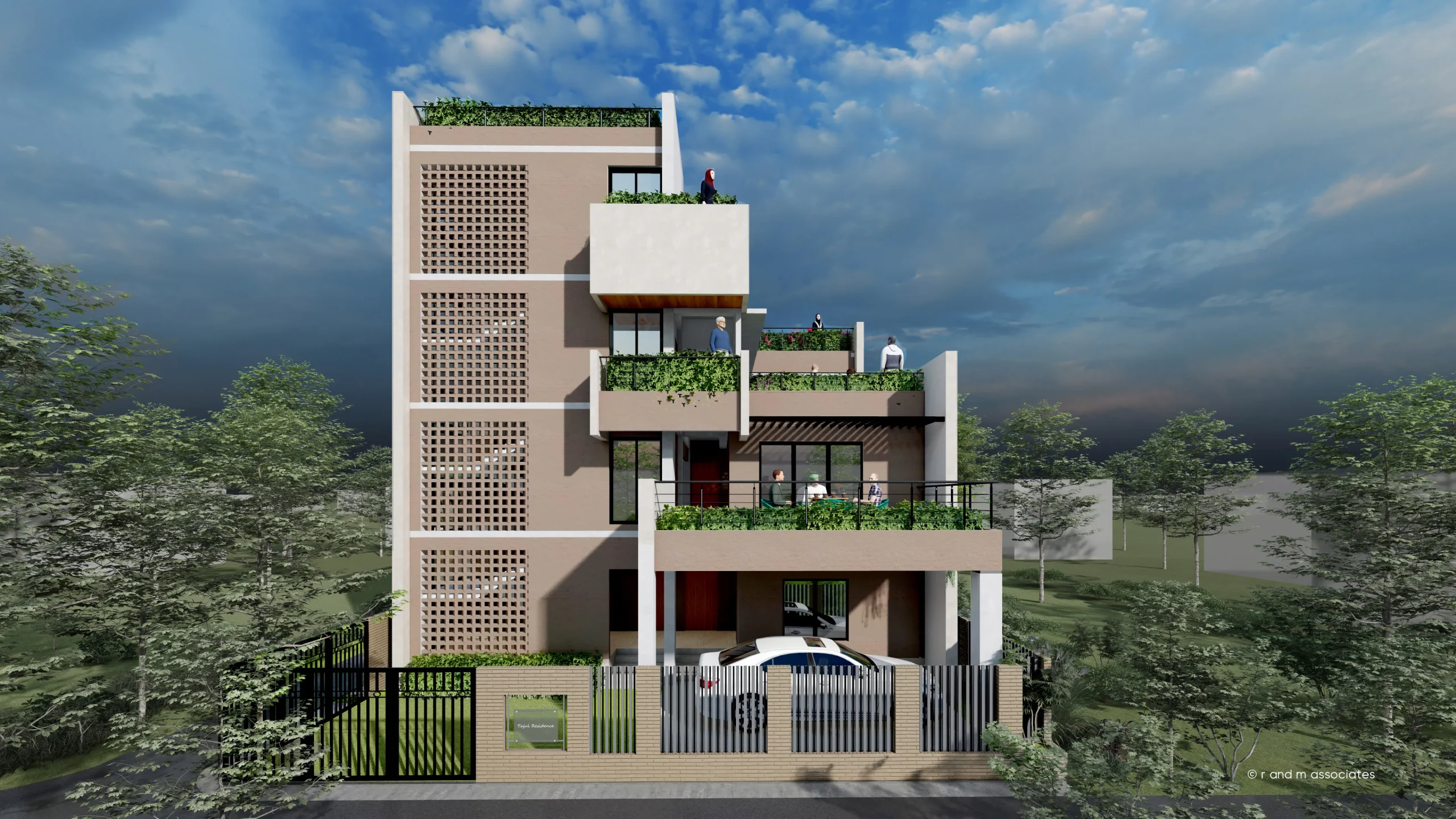 This triplex residence in Cumilla, Bangladesh, is conceived as a vertically layered garden home that maximizes outdoor living within a compact footprint. The form is generated through interlocking rectilinear volumes, stepped to create generous terraces and semi-open courts on each level. A perforated brick screen along the stair core introduces texture while ensuring ventilation and privacy. The façade combines soft neutral plaster, earthy tones, and expansive glazing, establishing a balanced dialogue between solidity and openness. Green roofs, planter-lined balconies, and lawn terraces integrate nature into everyday living, enhancing climatic comfort. Aesthetically, the building expresses contemporary tropical sensibility, where layered masses, light, and greenery compose a warm, breathable, and context-responsive residential environment.
