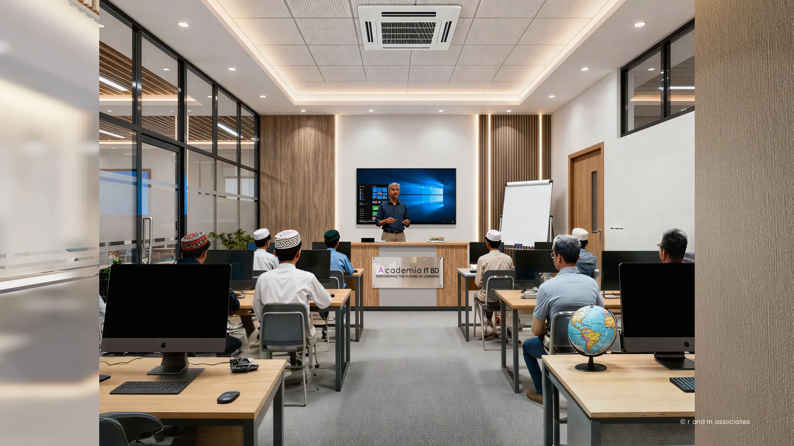 Academia IT BD in Comilla is designed as a contemporary, professional learning environment that reflects clarity, innovation, and approachability. The architectural concept focuses on clean lines and efficient spatial organization, creating a welcoming yet focused reception zone. The form is simple and linear, enhanced by vertical wooden slats that add rhythm and visual depth. A soft, neutral color palette of beige, light wood, white, and warm brown establishes a calm and modern atmosphere. Lighting is carefully layered with recessed lights, subtle cove illumination, and minimalist pendant fixtures to ensure visual comfort. Materials such as laminated wood panels, frosted glass partitions, and smooth tile flooring introduce refined textures and durability. The interior design is minimal and functional, resulting in a sleek, elegant, and professional aesthetic that supports learning and interaction.
