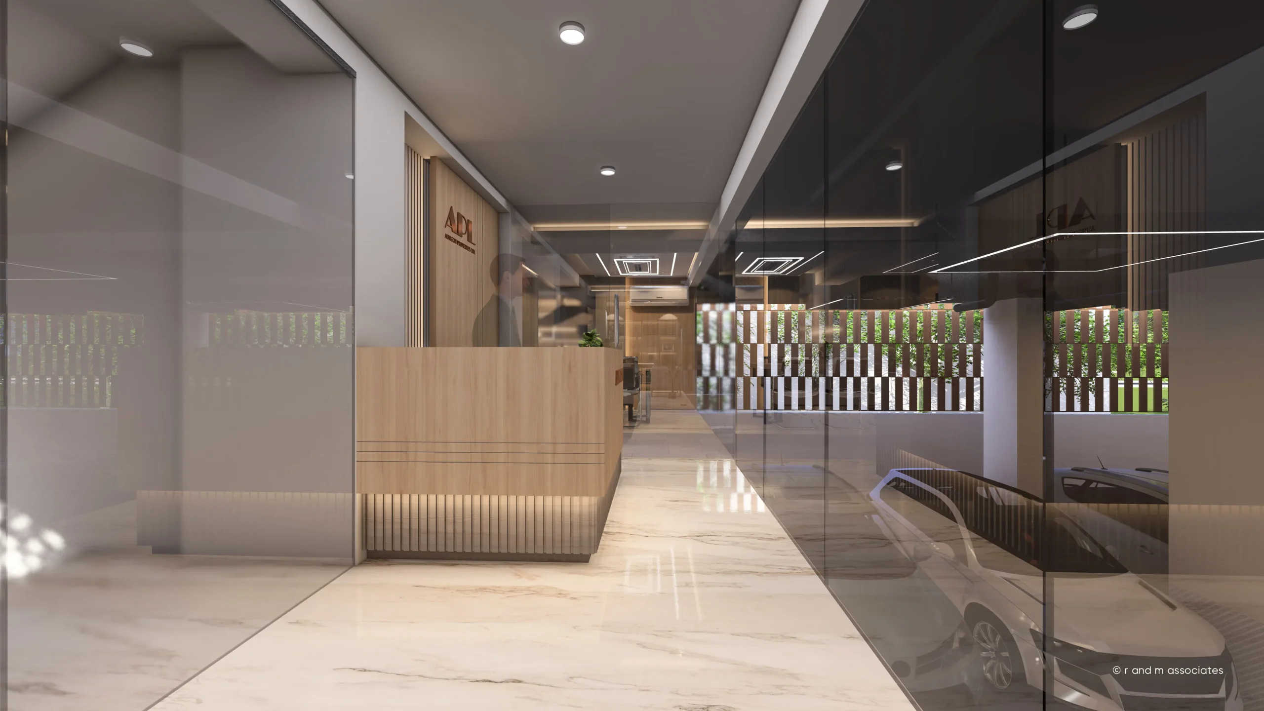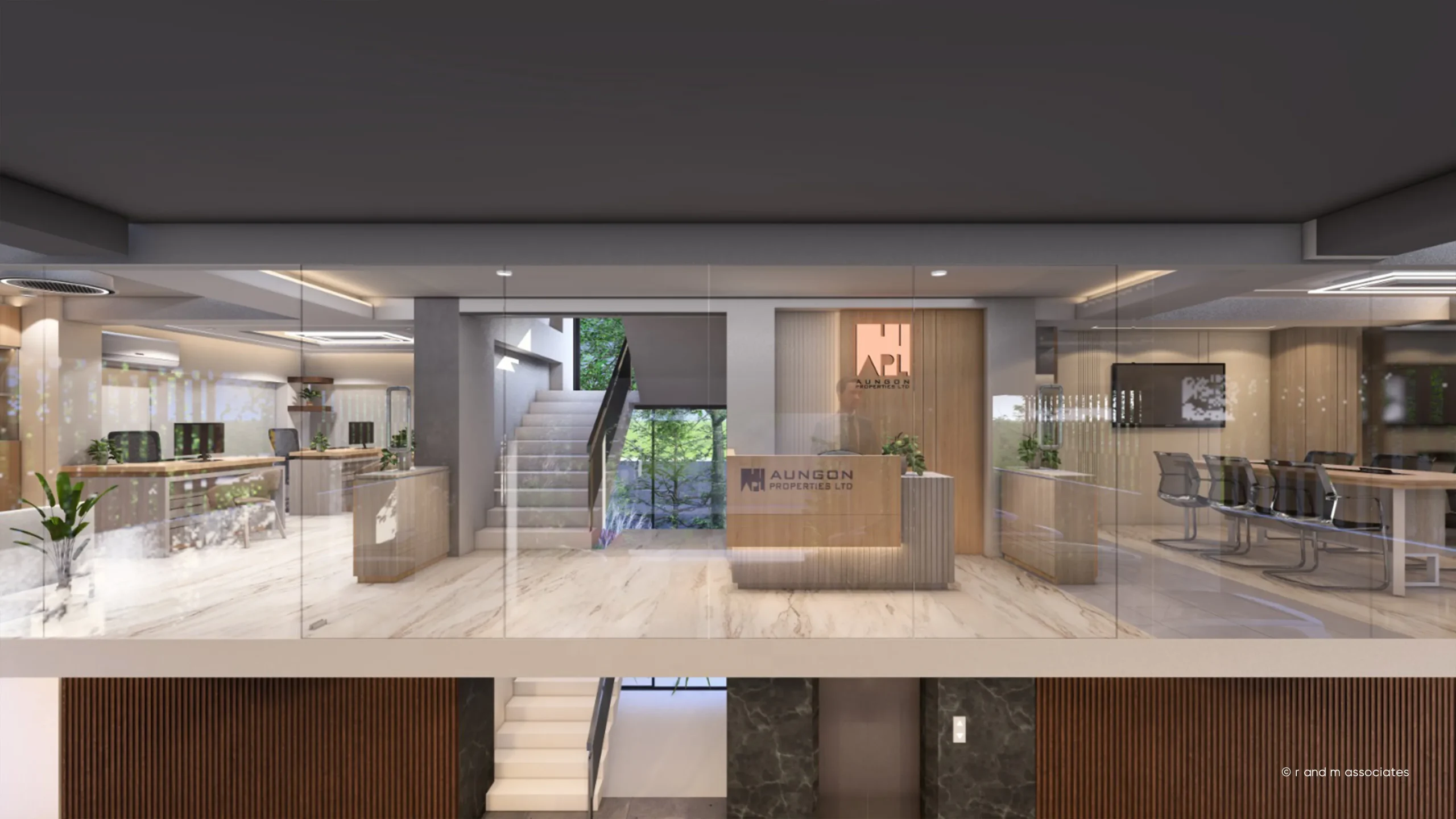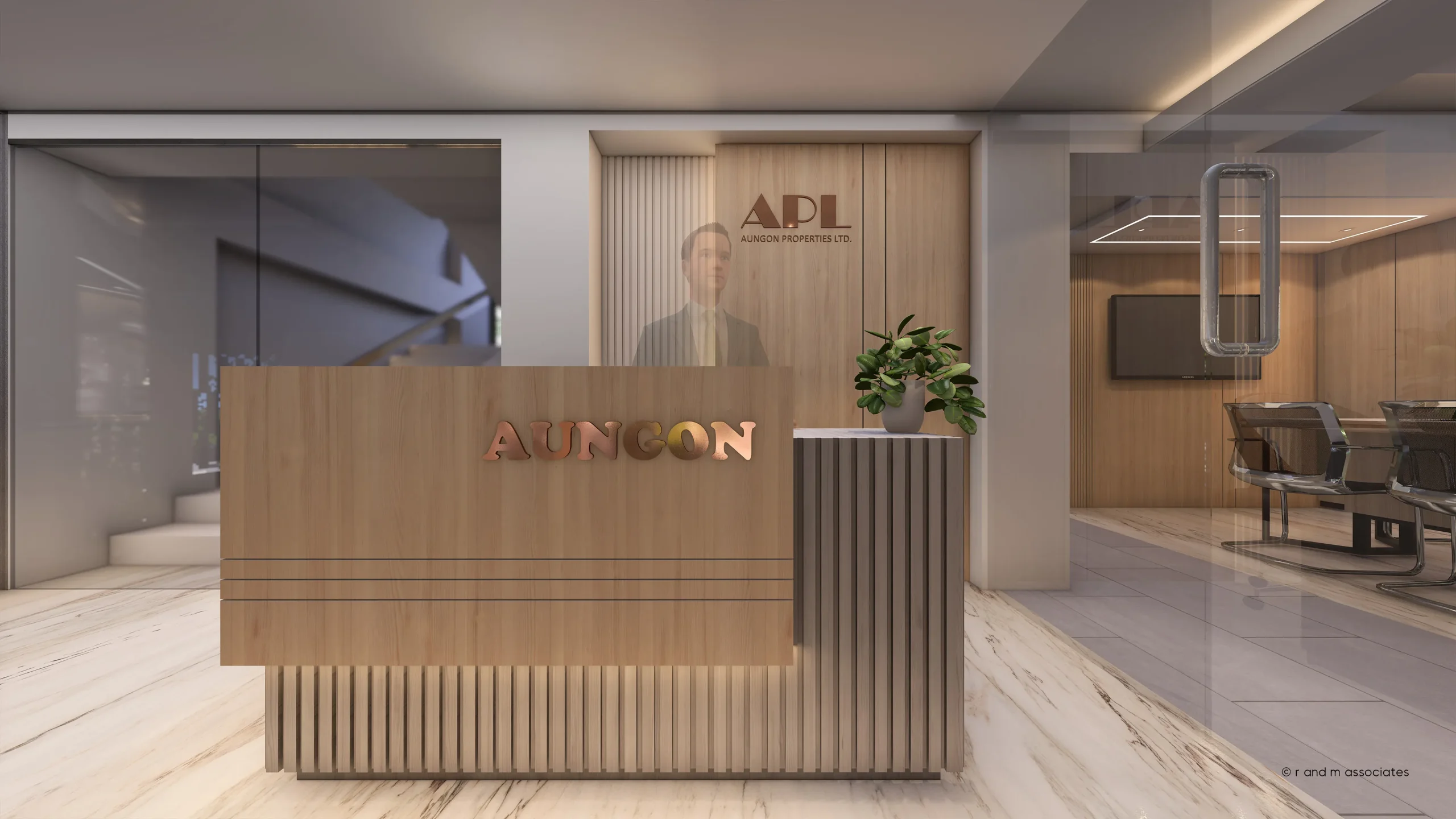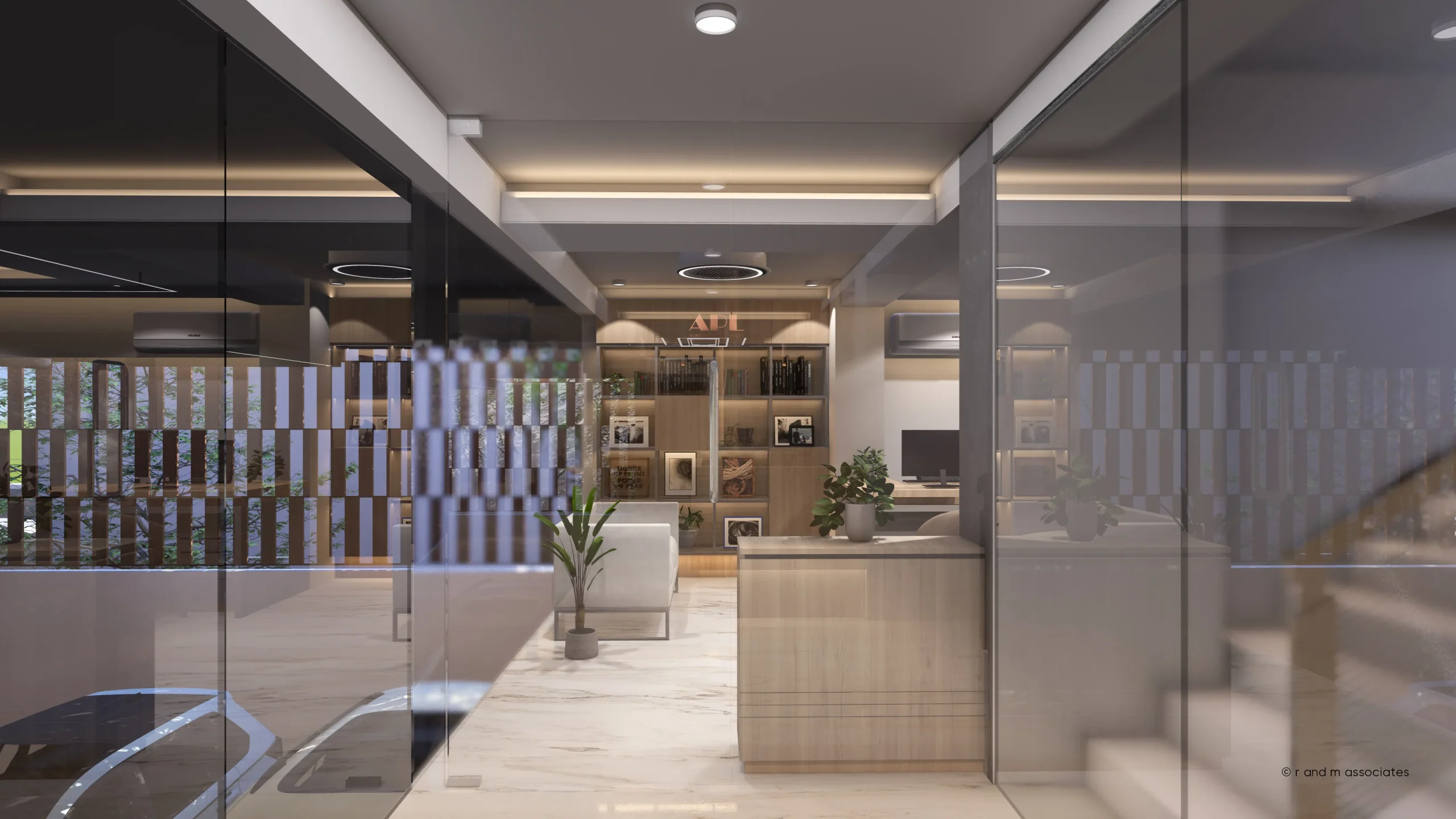 Aungon Properties Ltd, located in Sector 8, Jolshiri Abason, Dhaka, is conceived as a compact yet refined corporate workspace that emphasizes clarity and efficiency. The architectural concept is based on clean linear planning, organizing workstations along the perimeter to maximize openness and circulation. Soft neutral tones of beige, warm wood, and light grey create a calm, professional ambiance. Layered lighting—recessed ceiling strips, cove illumination, and spotlights—enhances spatial depth and highlights the geometric ceiling design. Materials such as laminated wood, textured wall finishes, marble flooring, and glass elements ensure durability with elegance. Subtle textures and indoor plants introduce warmth, resulting in a modern, minimalist, and welcoming office aesthetic.