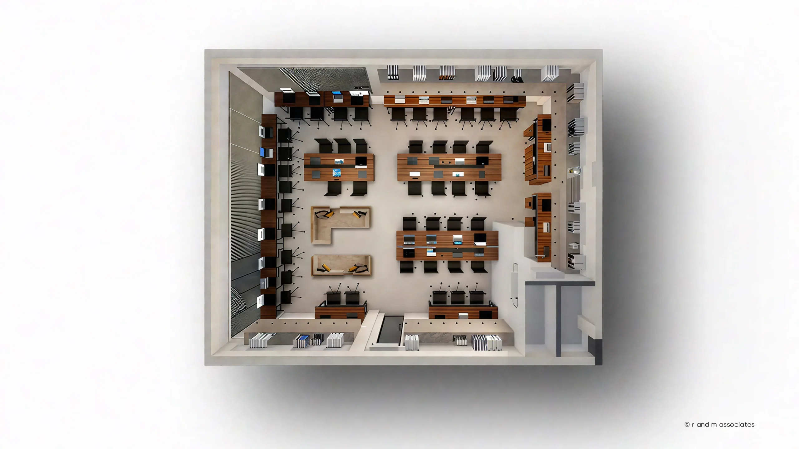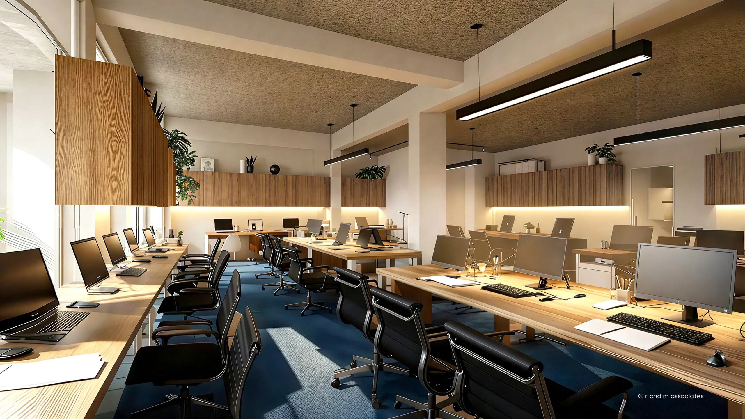Faculty Workstation, SU, located in Panthapath, Dhaka, is conceived as a modern academic workspace that promotes collaboration and focus. The architectural concept emphasizes openness and linear form, organizing workstations in parallel rows to ensure visual connectivity and efficient circulation. A warm neutral color palette of beige, wood tones, and muted grey creates a calm and professional atmosphere. Natural daylight from large windows blends with suspended linear LED fixtures, providing balanced illumination. Materials such as laminated wood, glass partitions, metal frames, and acoustic ceiling panels enhance functionality and durability. Subtle textures in wood grain and fabric finishes add depth. The overall aesthetic is modern, minimal, and ergonomically refined, reflecting academic professionalism.
