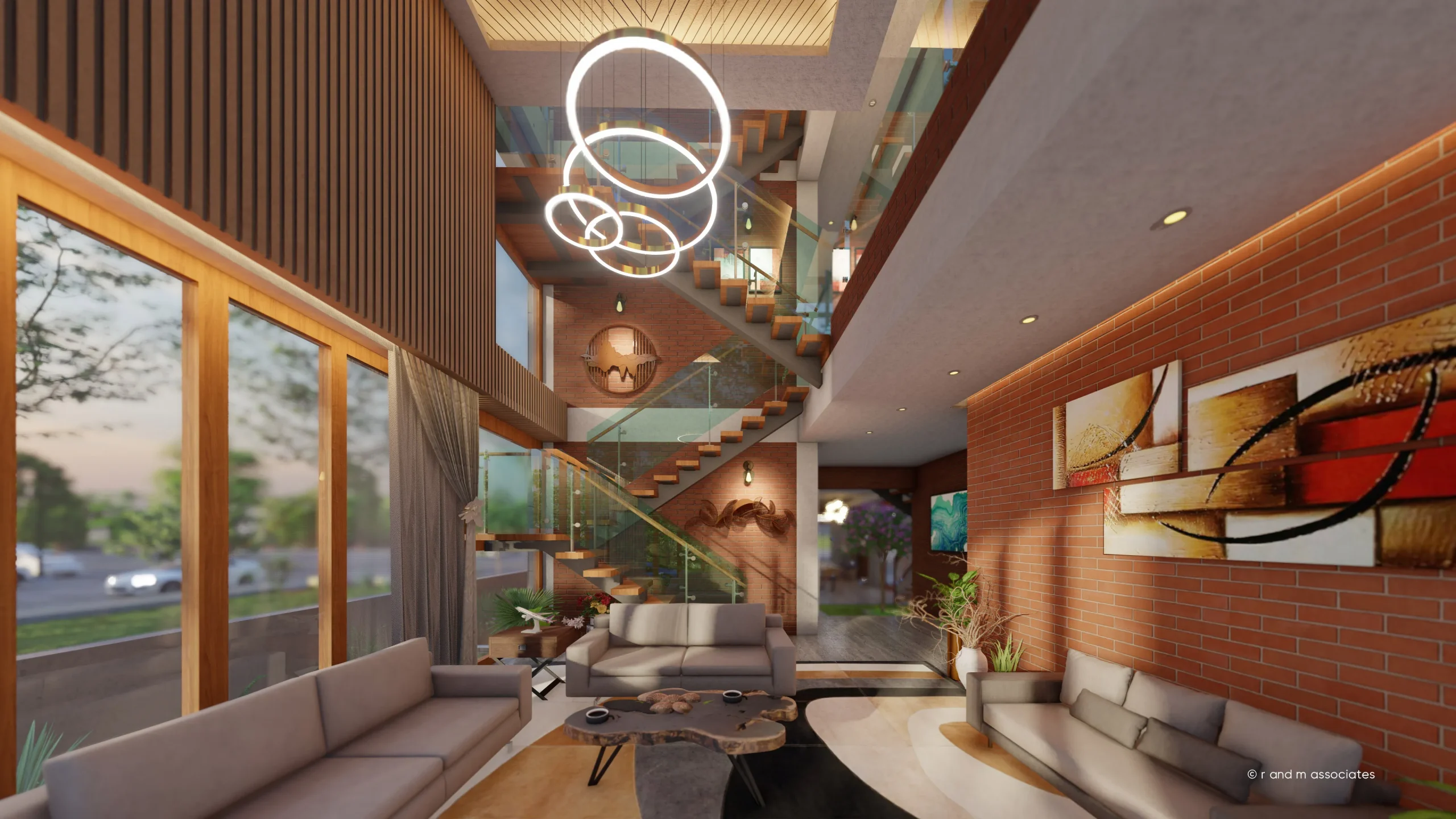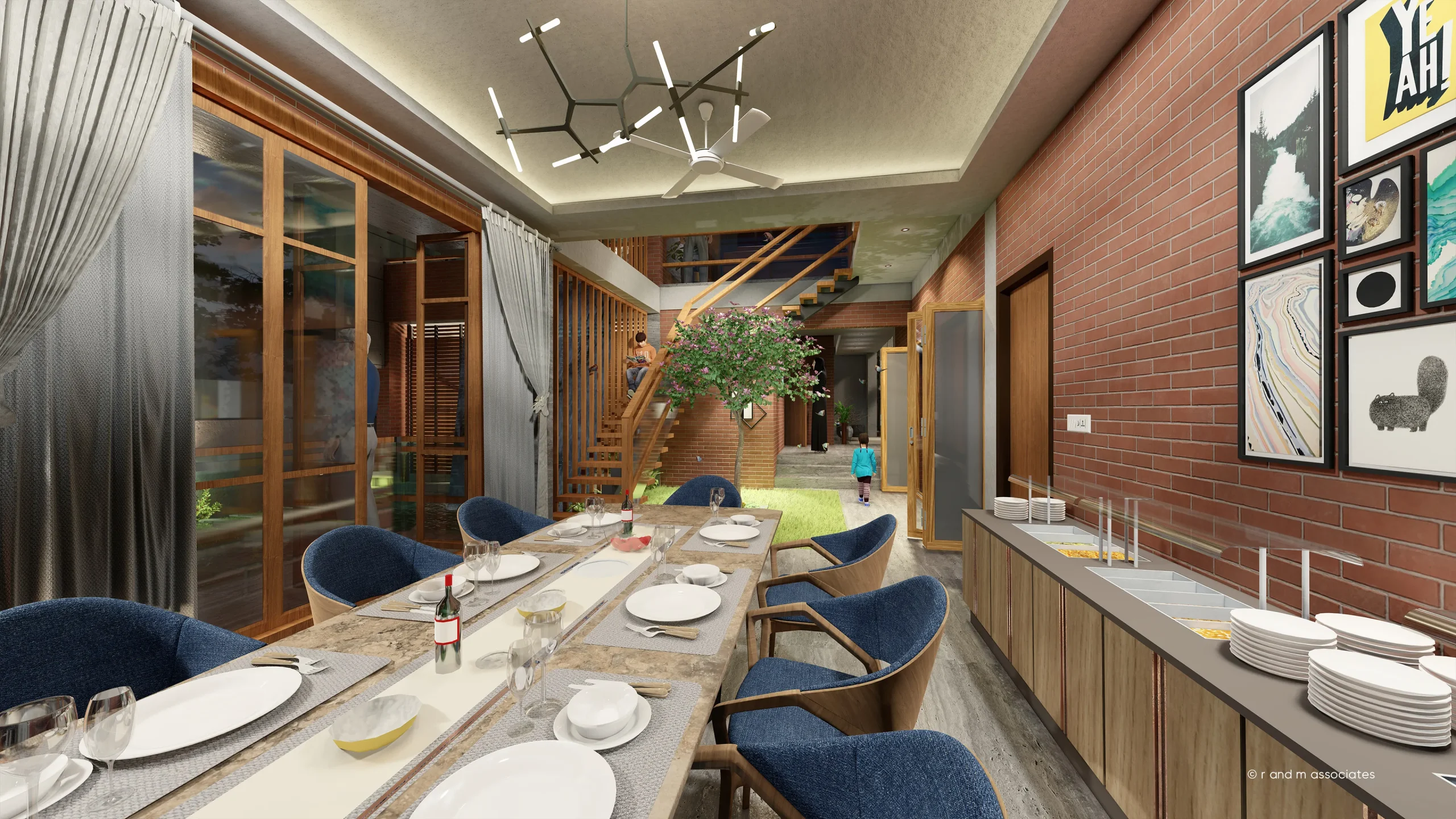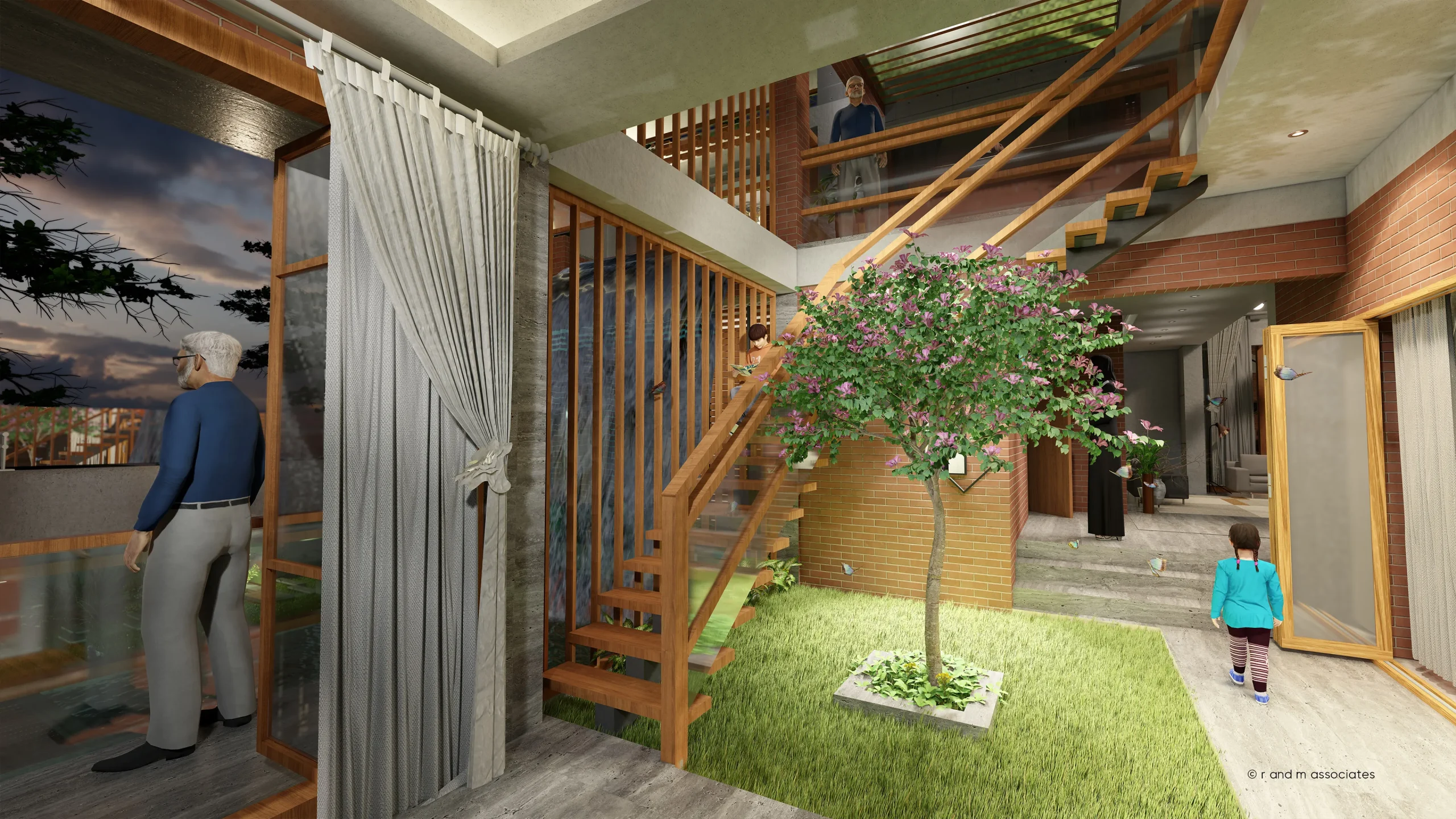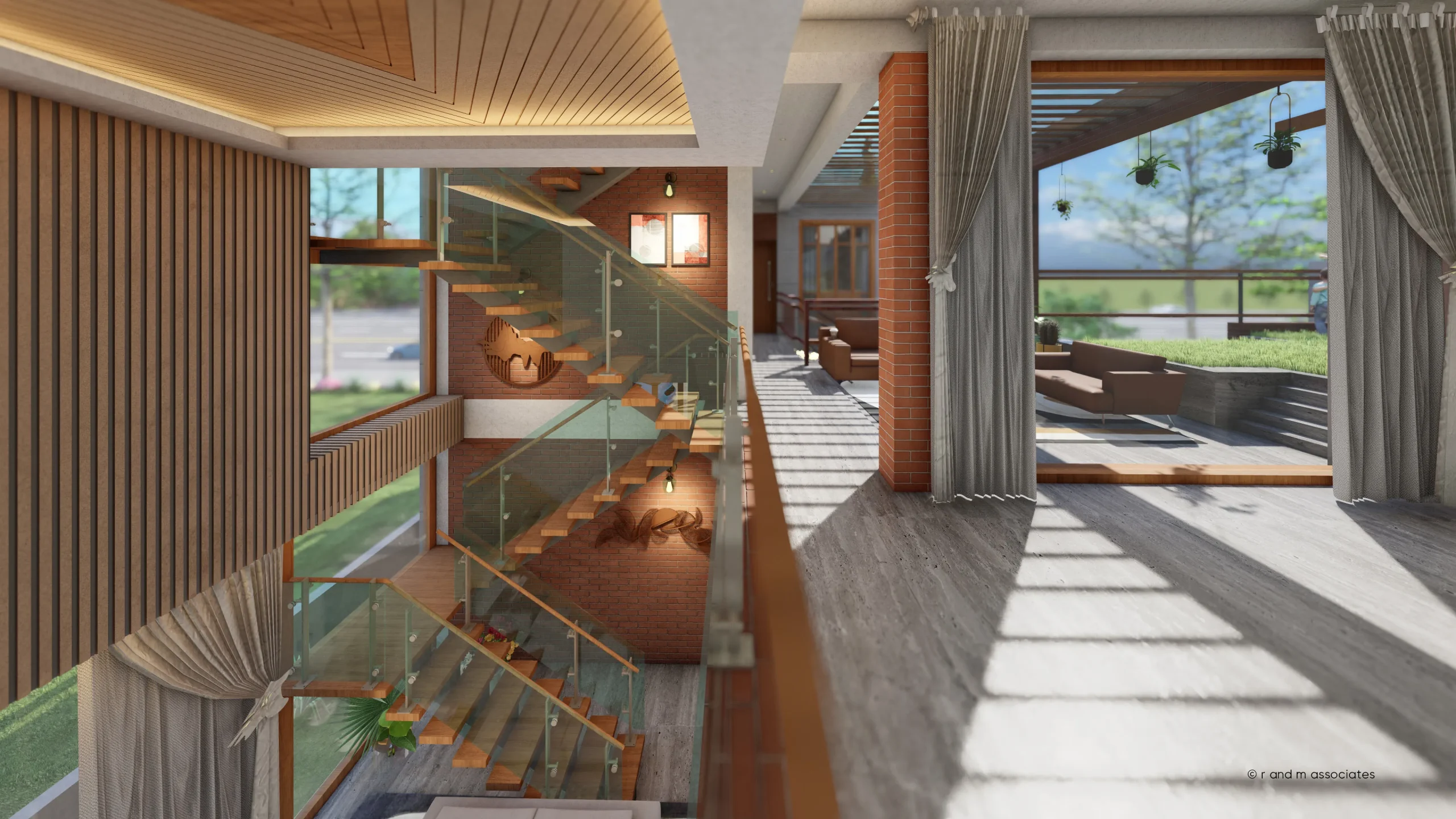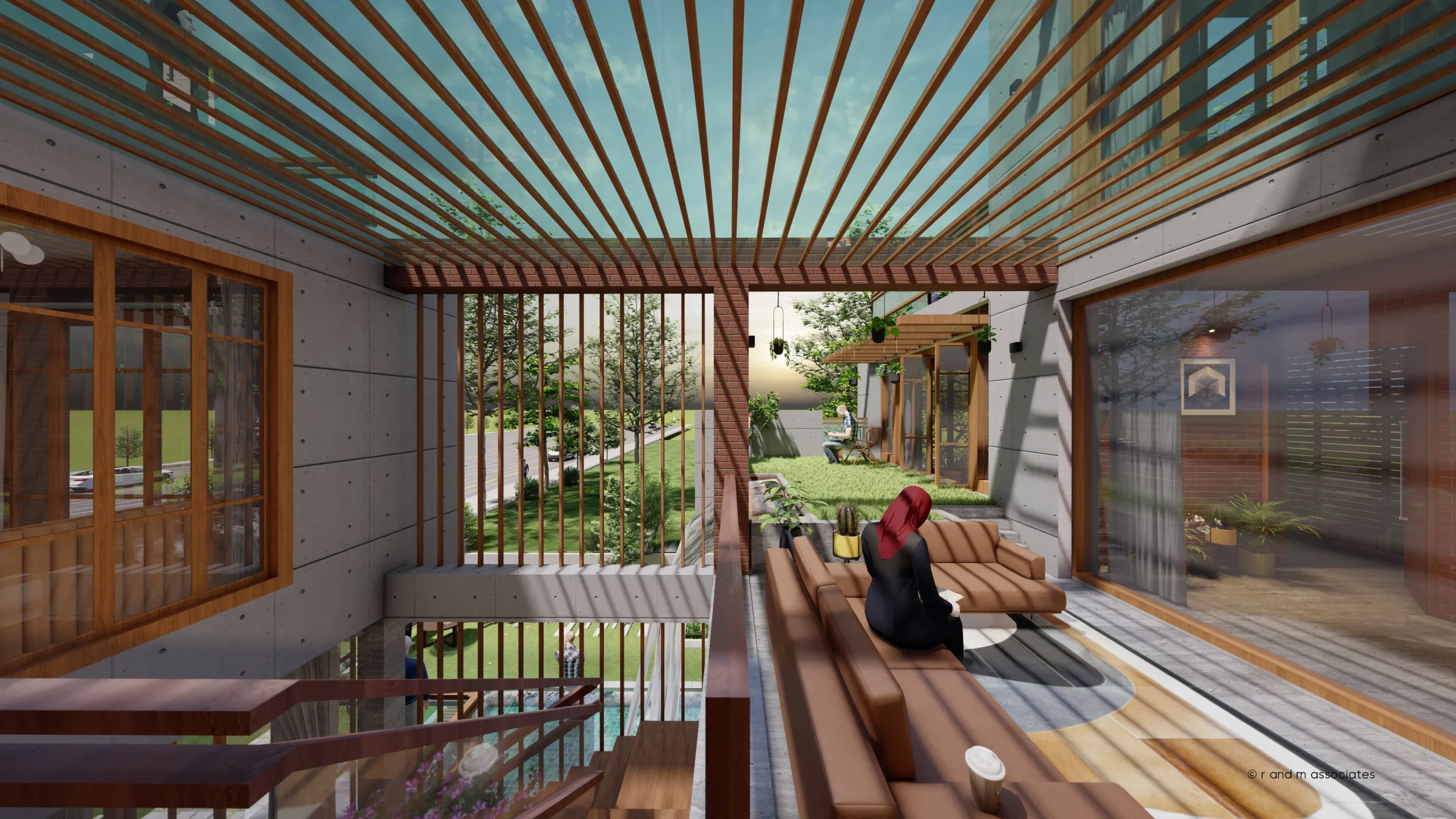 Nasreen Villa, located in Jolshiri Abason, Dhaka, presents a contemporary tropical interior rooted in openness and spatial continuity. The architectural concept revolves around an internal courtyard that organizes movement, ventilation, and visual connections. Clean rectilinear forms are softened by layered levels, open staircases, and voids that enhance vertical interaction. A warm palette of exposed brick, natural wood, and neutral stone defines the color and material language, creating a calm yet refined atmosphere. Abundant daylight filters through large openings, pergolas, and glass partitions, complemented by soft artificial lighting for evening warmth. Textures are tactile and honest, blending modern minimalism with biophilic elements, resulting in a balanced, elegant, and livable aesthetic.
