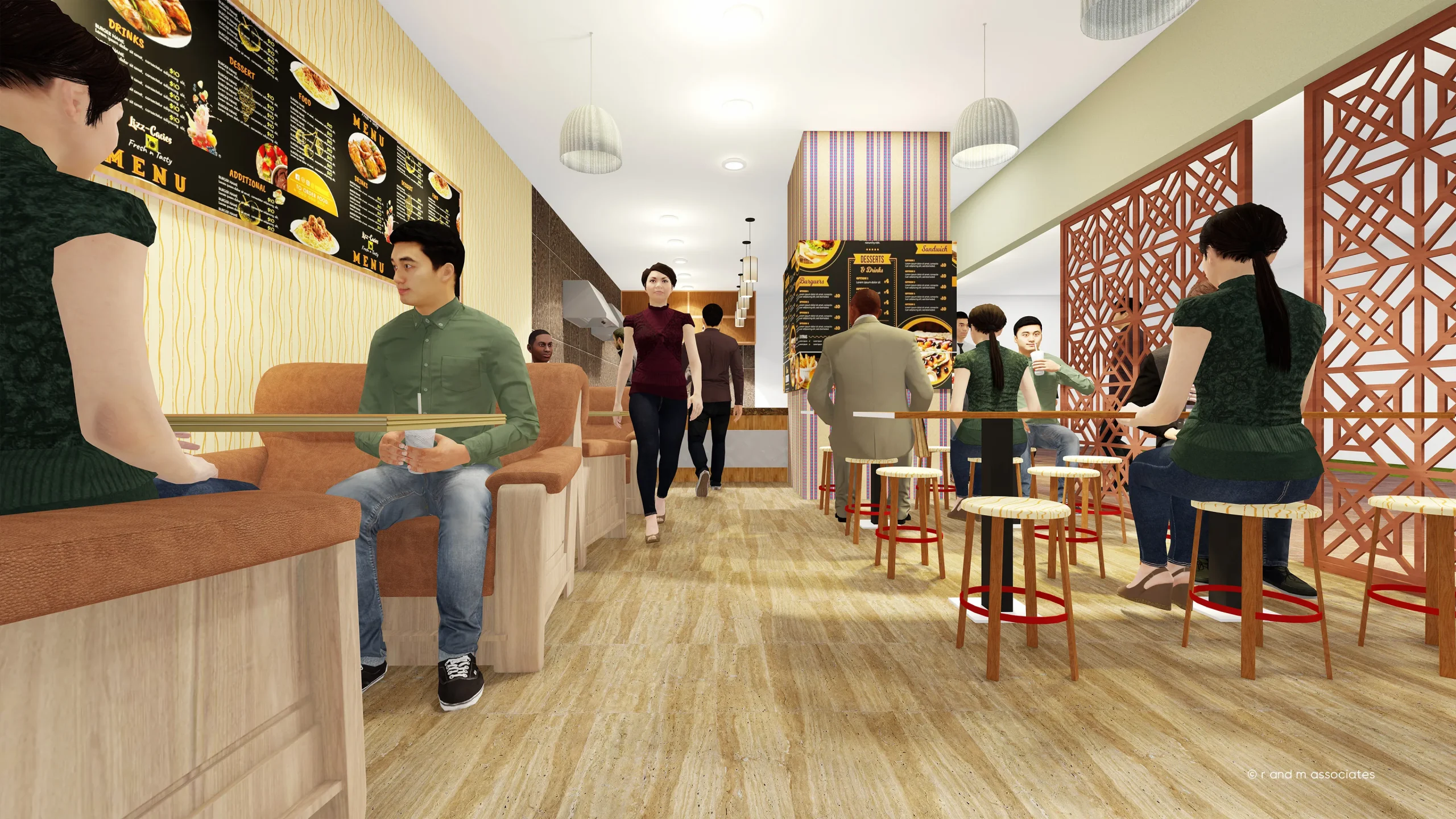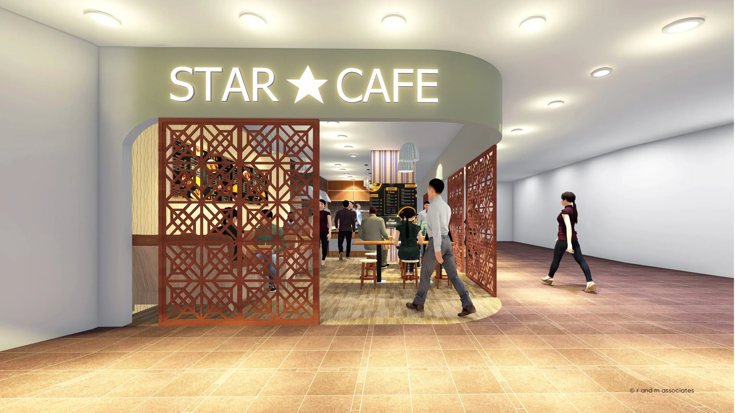 Star Cafe in Malaysia is conceived as a contemporary social hub that blends warmth, rhythm, and cultural subtlety. The architectural concept emphasizes openness and flow, with linear planning that guides movement from entrance to counter while encouraging interaction. Form is softened through geometric lattice screens that add visual depth and spatial layering. The color palette combines warm wood tones, earthy browns, and muted greens, creating a welcoming and grounded atmosphere. Lighting is thoughtfully layered, using pendant and recessed lights to balance functionality and ambience. Materials such as timber, stone countertops, and textured wall panels introduce tactile richness. Overall, the aesthetic is modern yet inviting, combining elegance with everyday comfort.