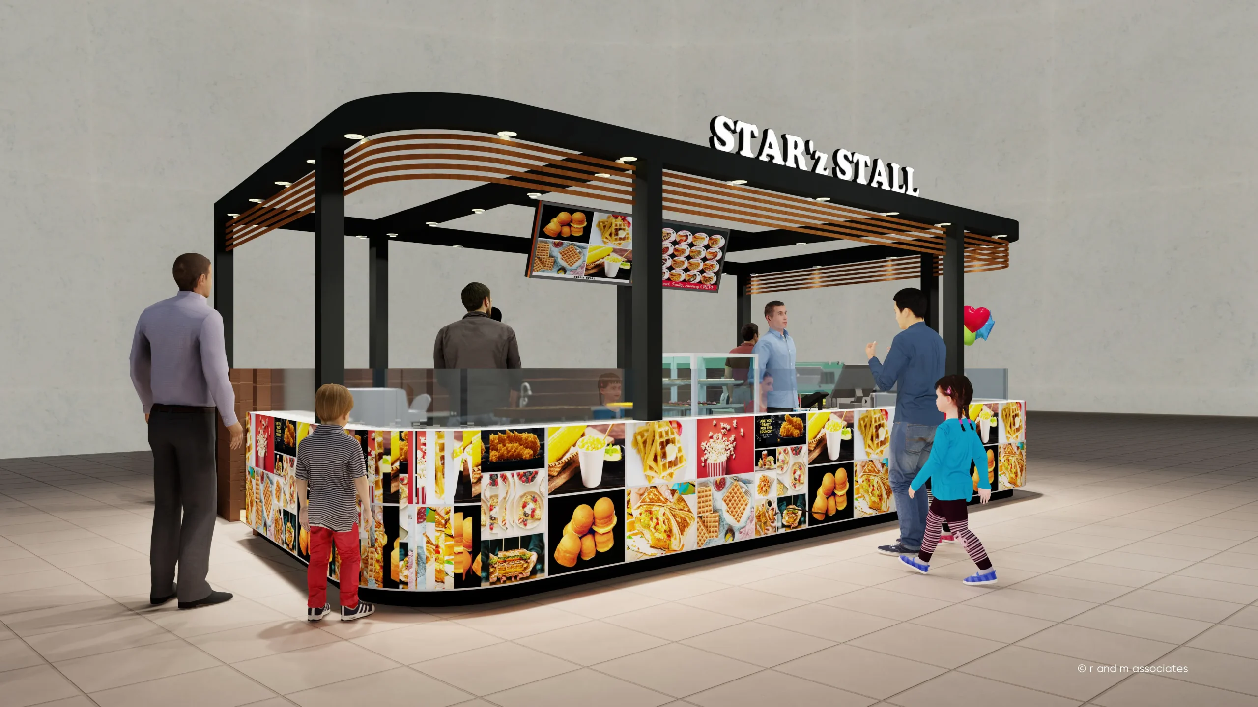 STAR’z STALL in Malaysia is conceived as a vibrant, contemporary kiosk that emphasizes visibility, efficiency, and customer engagement within a public mall setting. The architectural concept centers on a compact, symmetrical form with an open frontage, allowing seamless interaction from all sides. Bold graphic panels and illuminated signage define the stall’s identity, while a lively color palette of black, warm wood tones, and vibrant food imagery enhances visual appeal. Lighting is integrated into the canopy and display panels to highlight products and create a dynamic glow. Materials such as metal framing, laminated finishes, and glossy surfaces ensure durability and ease of maintenance. Textures are clean and sleek, resulting in a playful, modern, and energetic aesthetic.