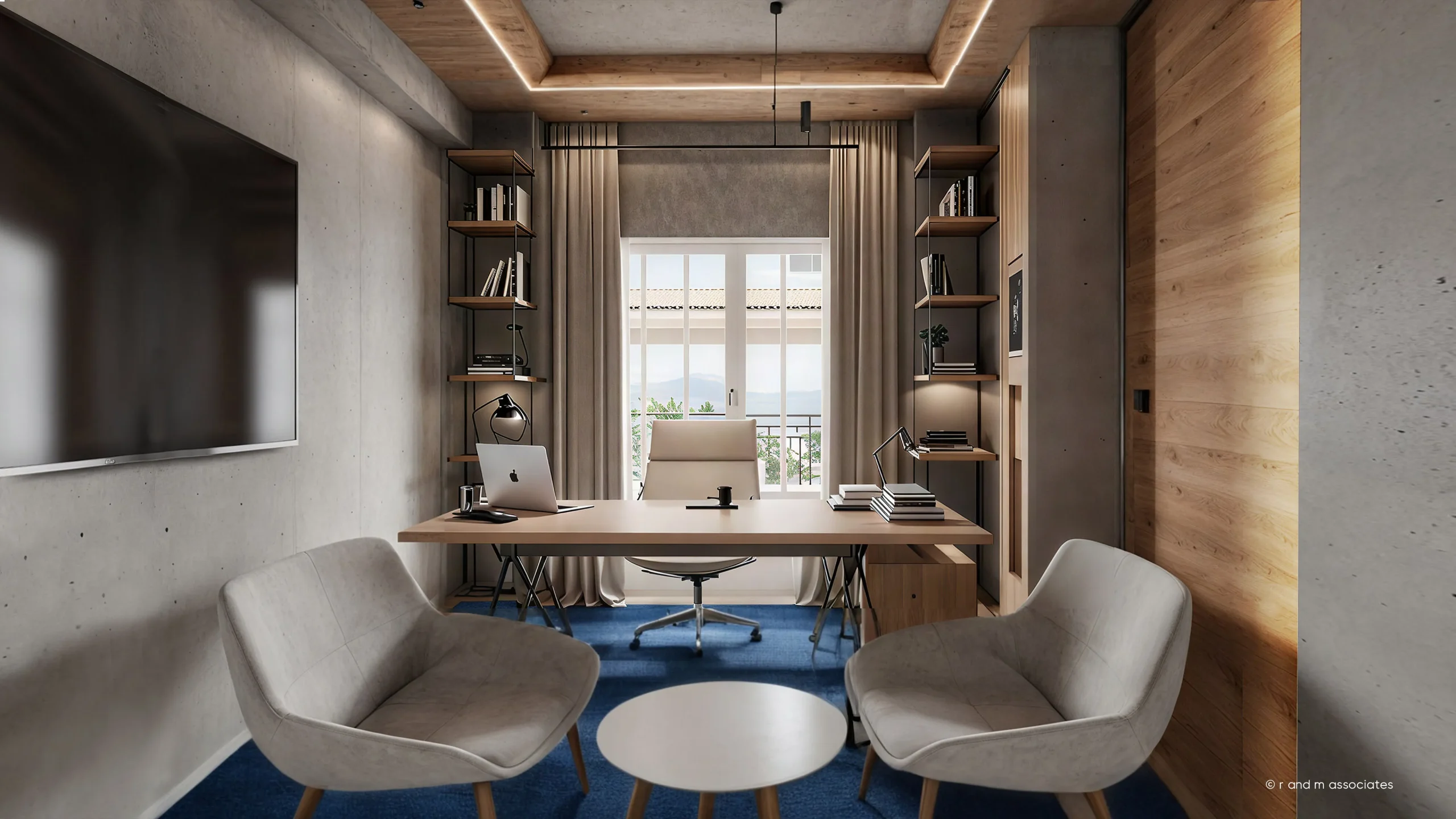 The TBFL Corporate Office in Uttara, Dhaka is conceived as a calm, contemporary workspace that balances functionality with refined aesthetics. The architectural concept emphasizes clarity of form through clean lines, balanced proportions, and well-defined spatial zoning. A restrained color palette of warm wood tones, soft greys, muted blues, and earthy browns creates a professional yet inviting atmosphere. Natural light is maximized through large openings, while layered artificial lighting—track lights, concealed LEDs, and task lighting—enhances depth and focus. Materials such as exposed concrete, timber panels, leather, and metal introduce rich textures and tactile contrast. The interior design reflects a modern corporate identity with minimalist furniture, integrated storage, greenery, and a cohesive, timeless aesthetic.