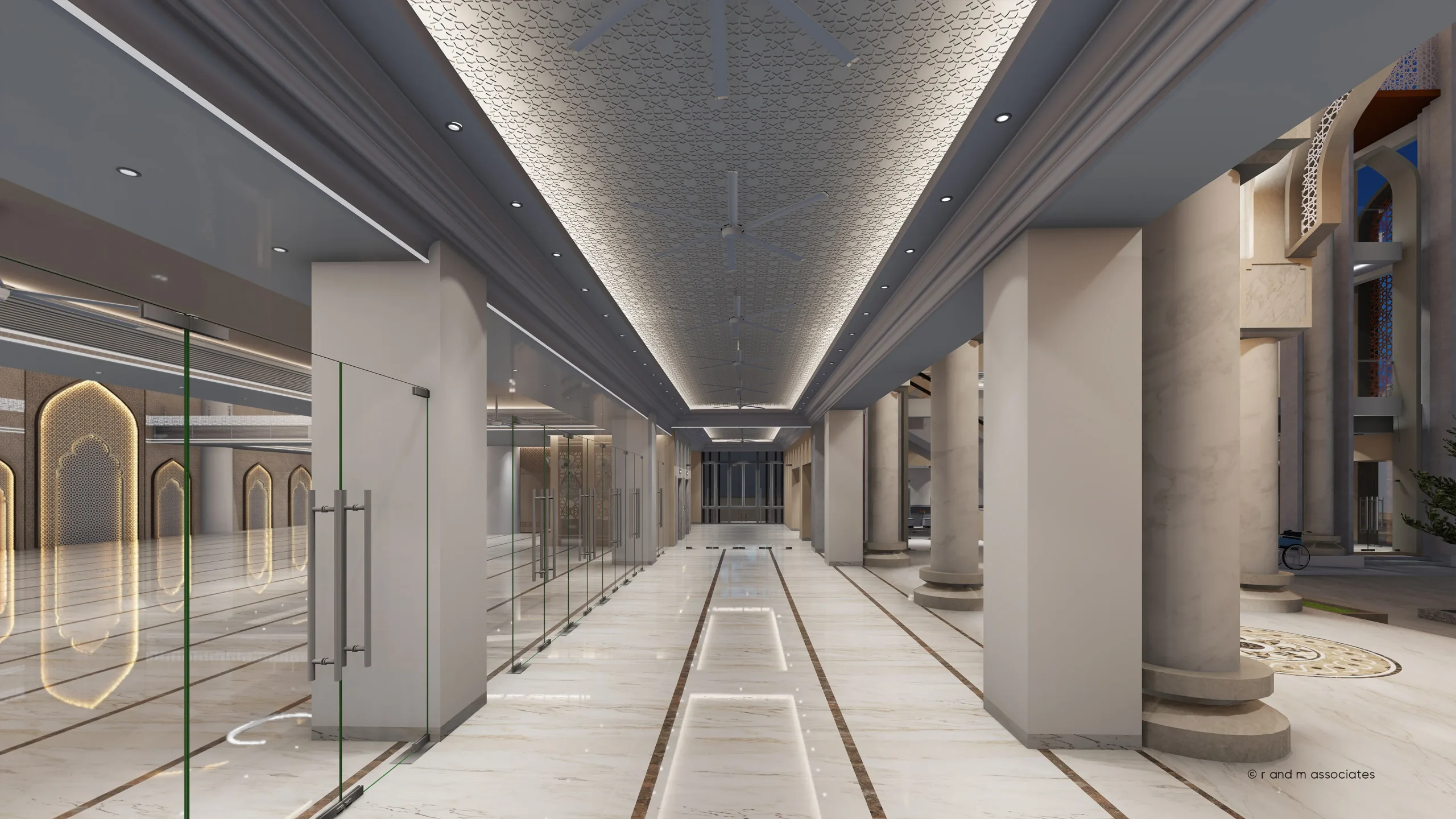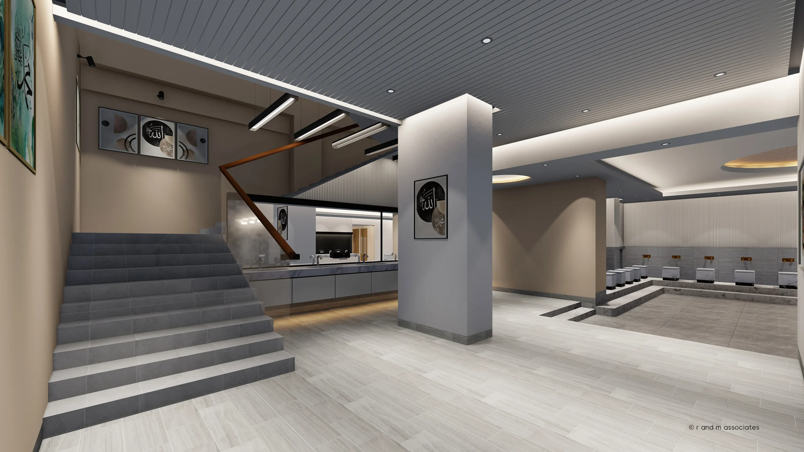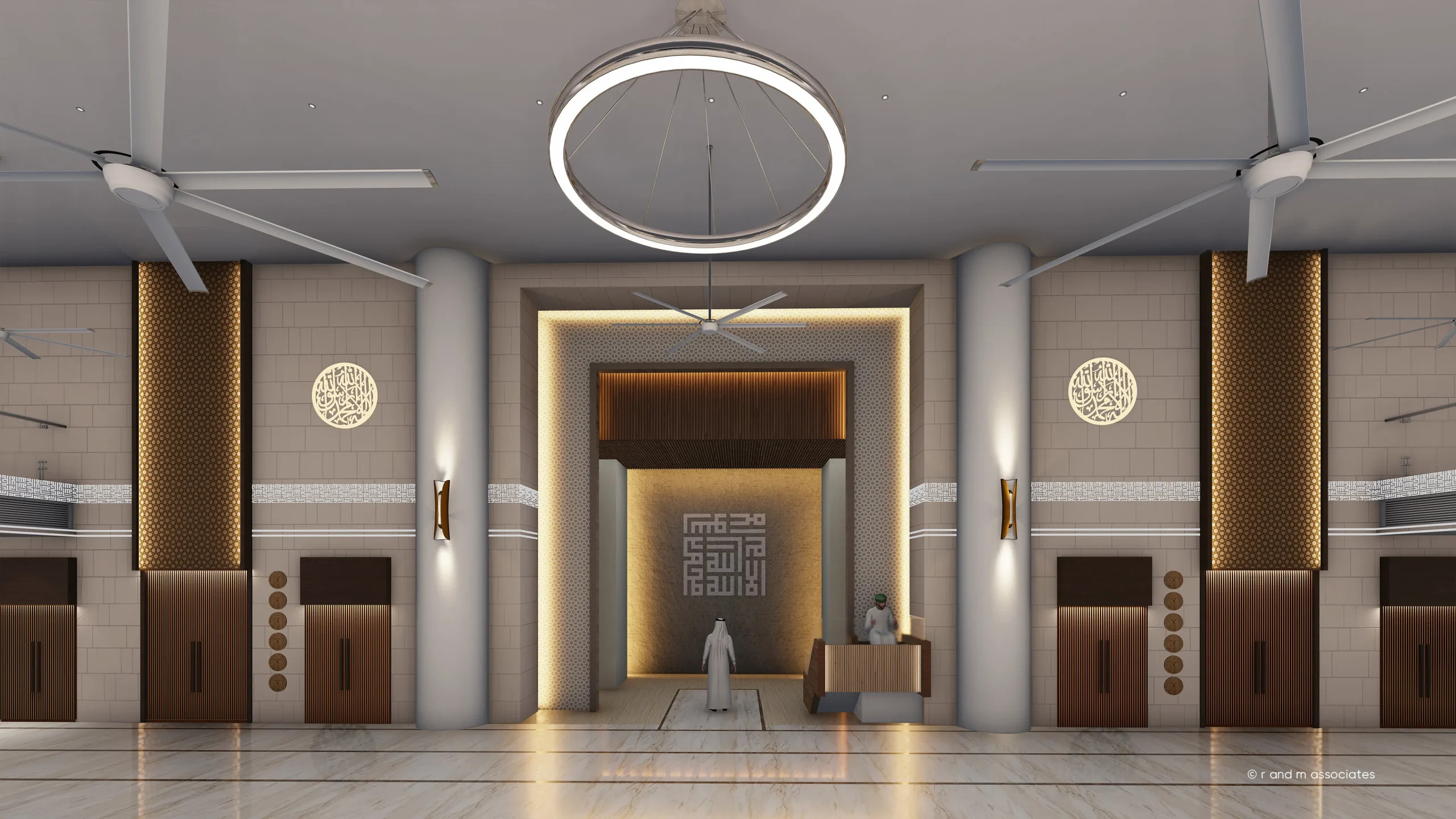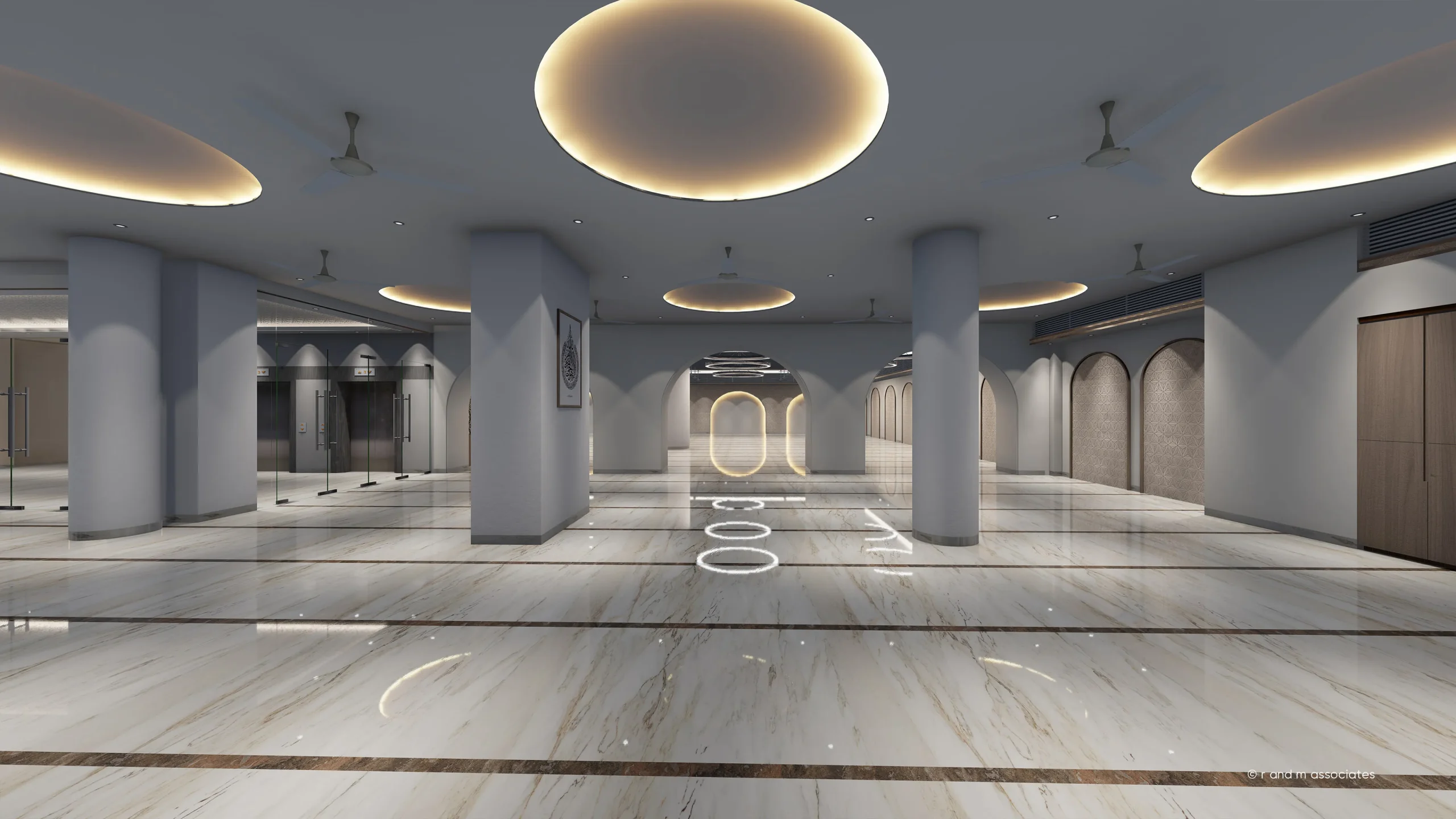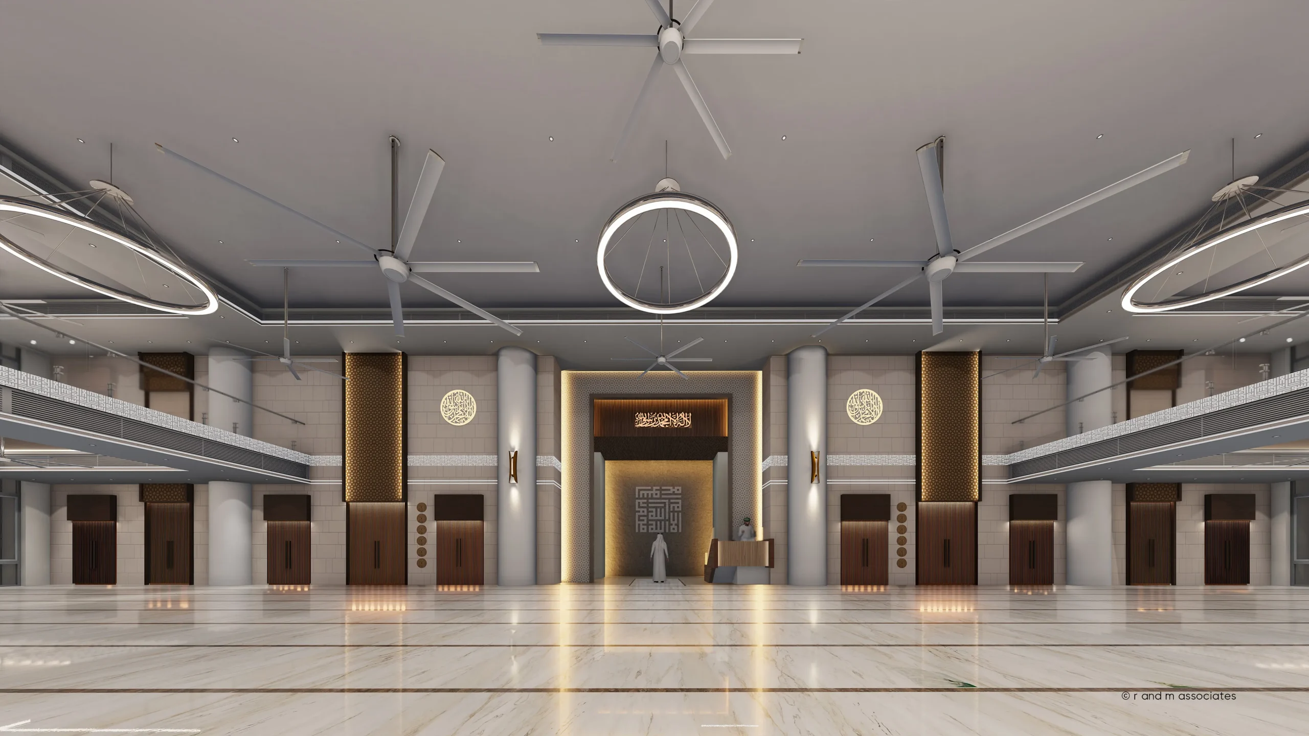 Uttara 7 No. Sector Jam-e-Masjid in Uttara, Dhaka is conceived as a contemporary sacred interior that balances monumentality with calm precision. The architectural concept emphasizes symmetry, axial order, and vertical clarity, guiding worshippers toward the mihrab as the spiritual anchor. Strong columnar forms and layered wall compositions define the spatial rhythm. A restrained palette of soft greys, ivory, and warm wood tones creates a serene, dignified atmosphere. Lighting is carefully layered with recessed fixtures, cove lighting, and circular pendant elements that enhance depth without distraction. Materials such as polished marble flooring, textured stone walls, perforated panels, and timber accents introduce tactile richness. The interior design merges modern detailing with Islamic geometry, resulting in a refined, timeless, and spiritually uplifting aesthetic.