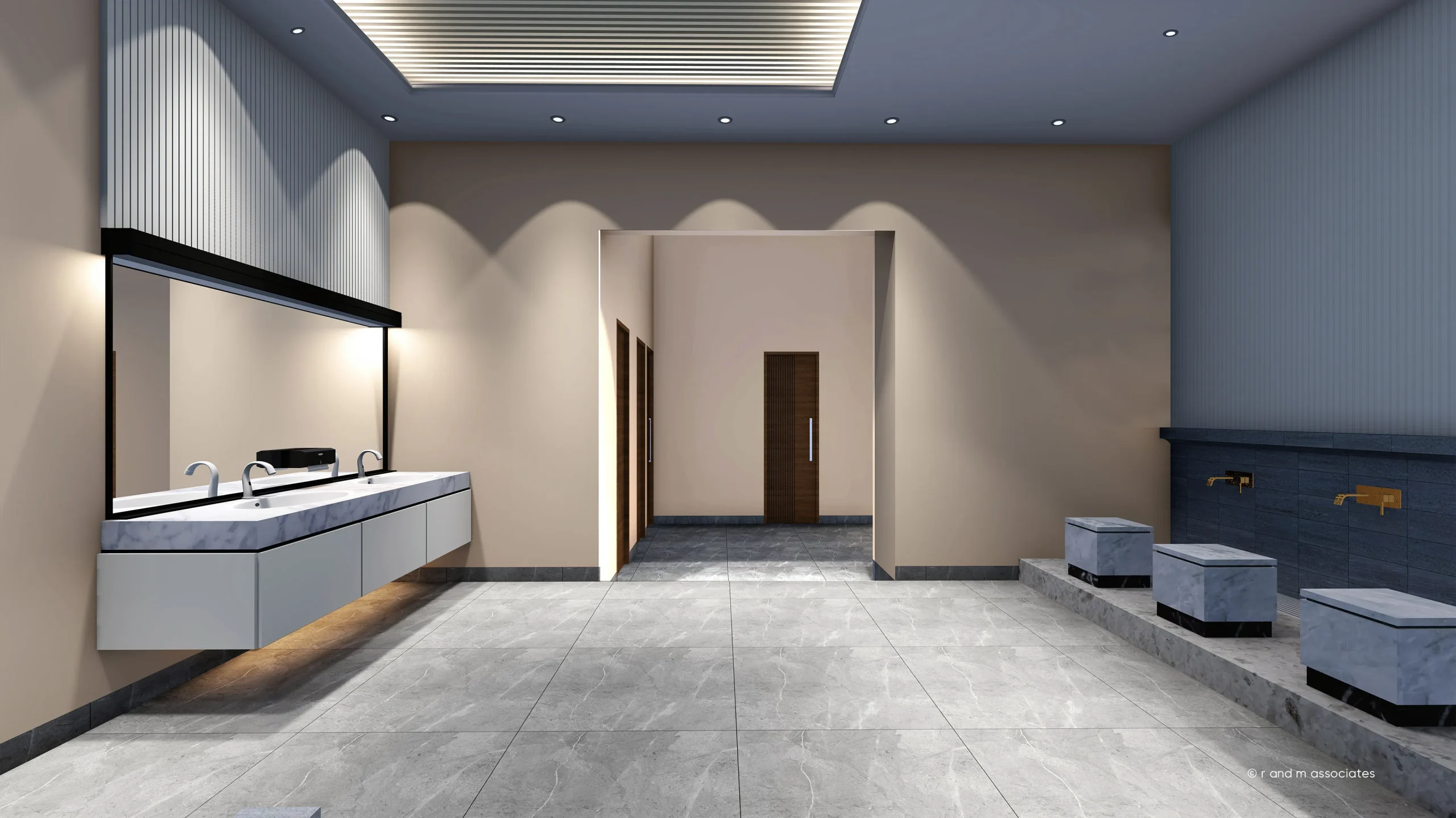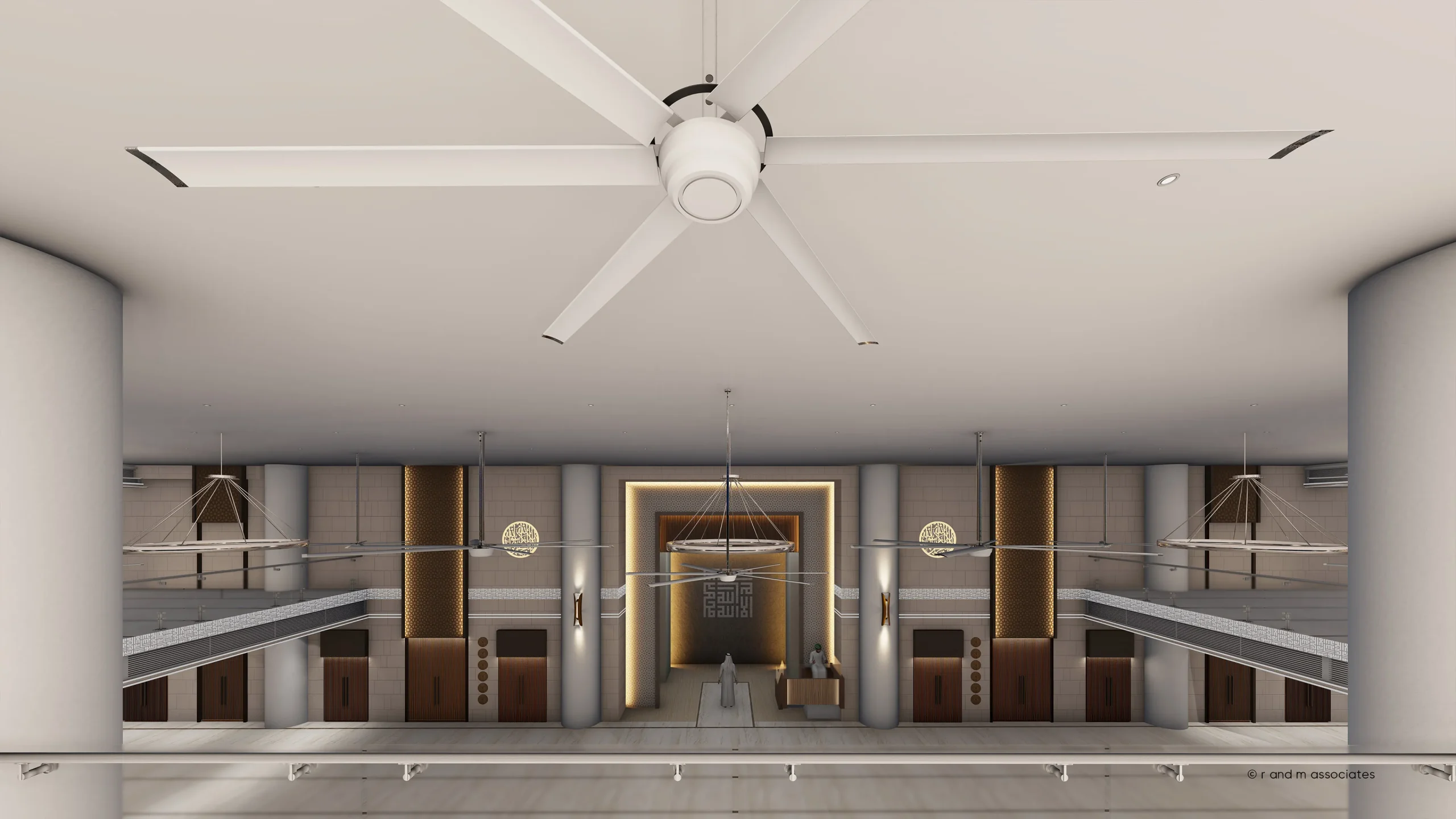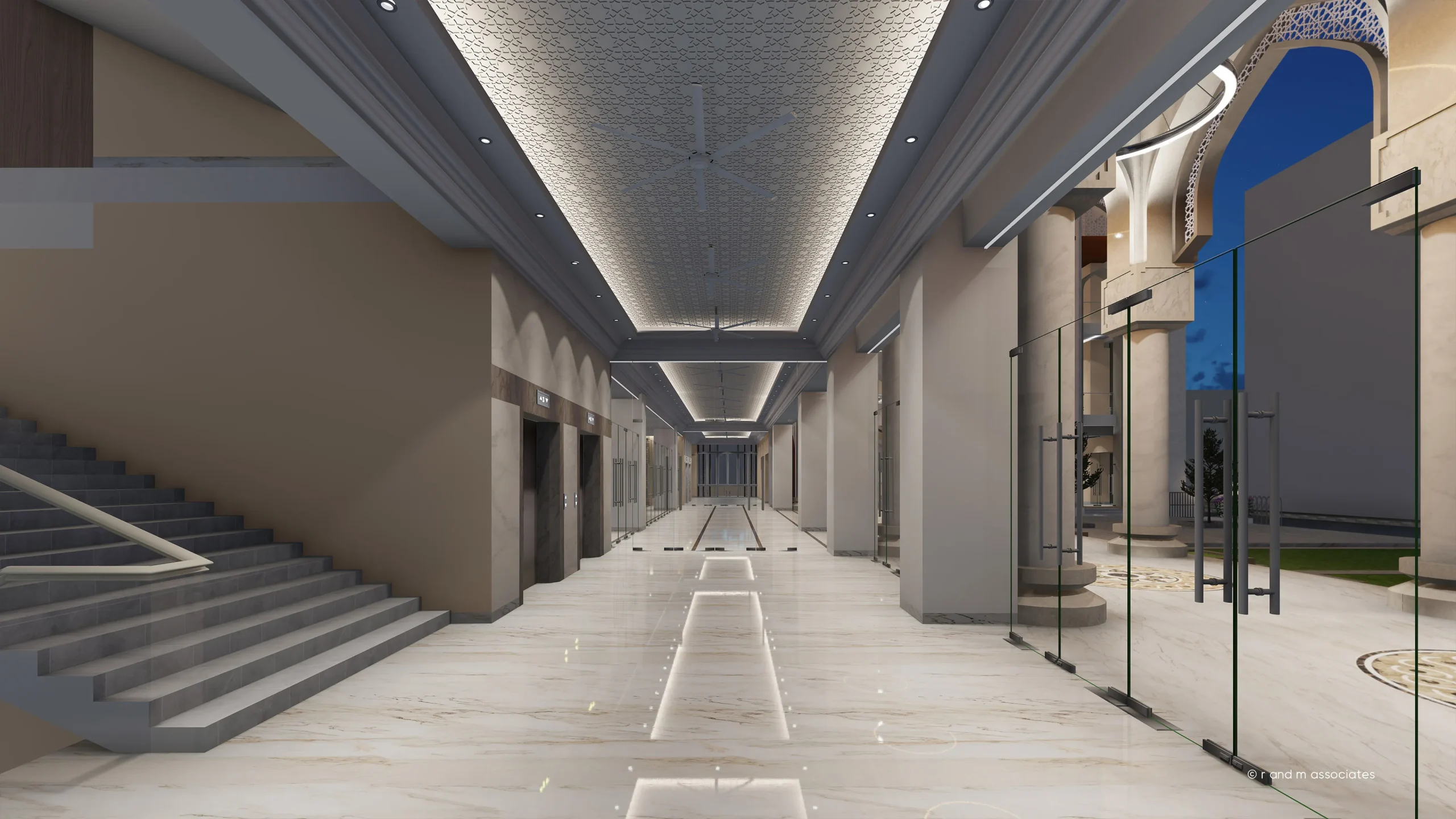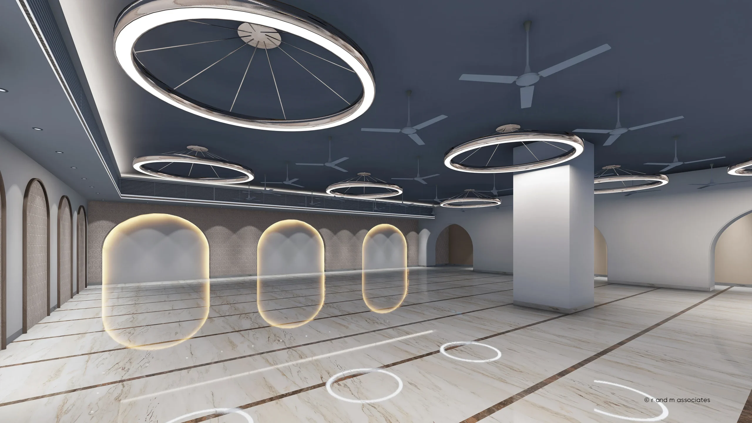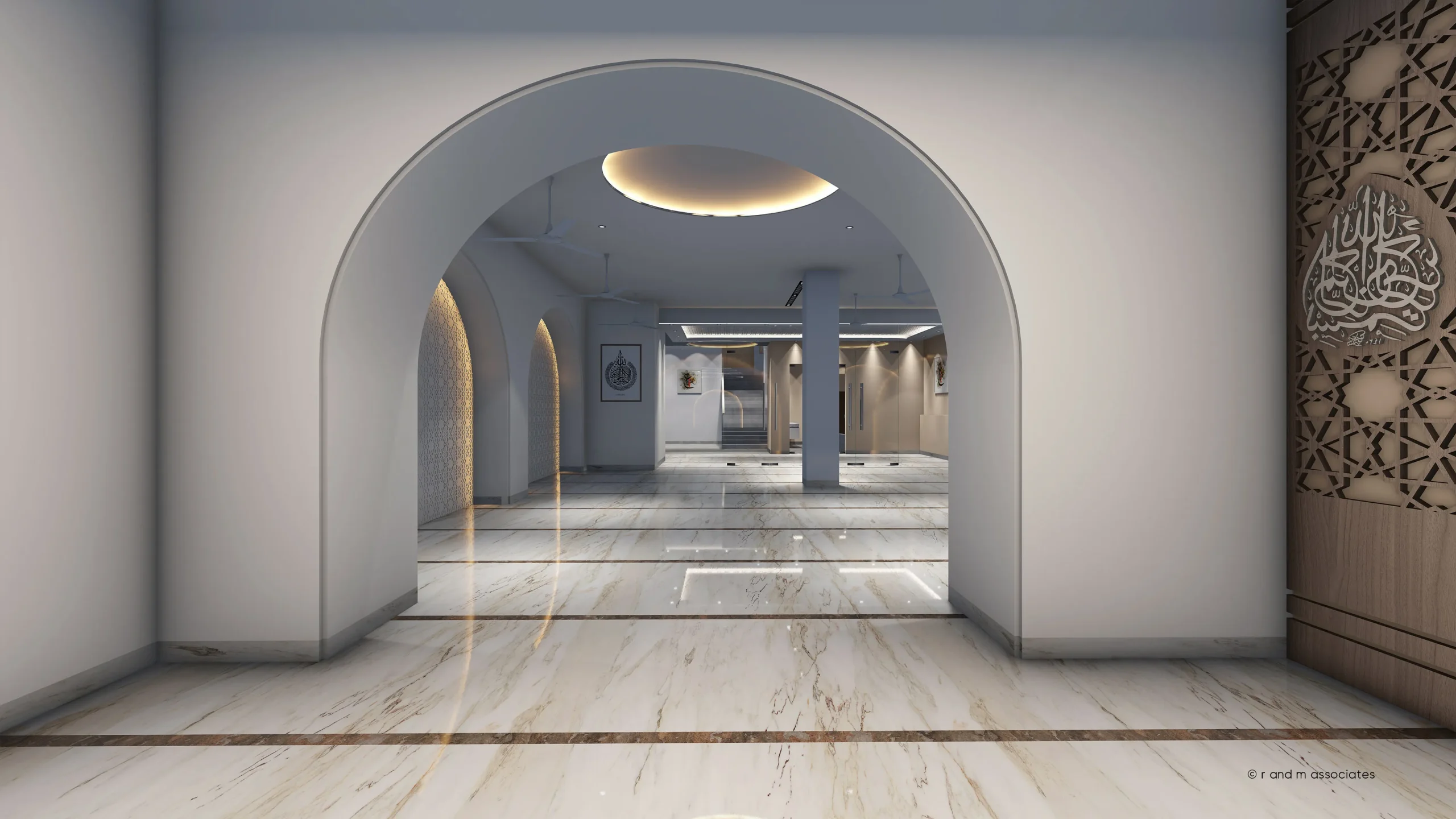 Uttara 7 No. Sector Jam-e-Masjid in Uttara, Dhaka is conceived as a contemporary sacred interior that balances monumentality with calm precision. The architectural concept emphasizes symmetry, axial order, and vertical clarity, guiding worshippers toward the mihrab as the spiritual anchor. Strong columnar forms and layered wall compositions define the spatial rhythm. A restrained palette of soft greys, ivory, and warm wood tones creates a serene, dignified atmosphere. Lighting is carefully layered with recessed fixtures, cove lighting, and circular pendant elements that enhance depth without distraction. Materials such as polished marble flooring, textured stone walls, perforated panels, and timber accents introduce tactile richness. The interior design merges modern detailing with Islamic geometry, resulting in a refined, timeless, and spiritually uplifting aesthetic.