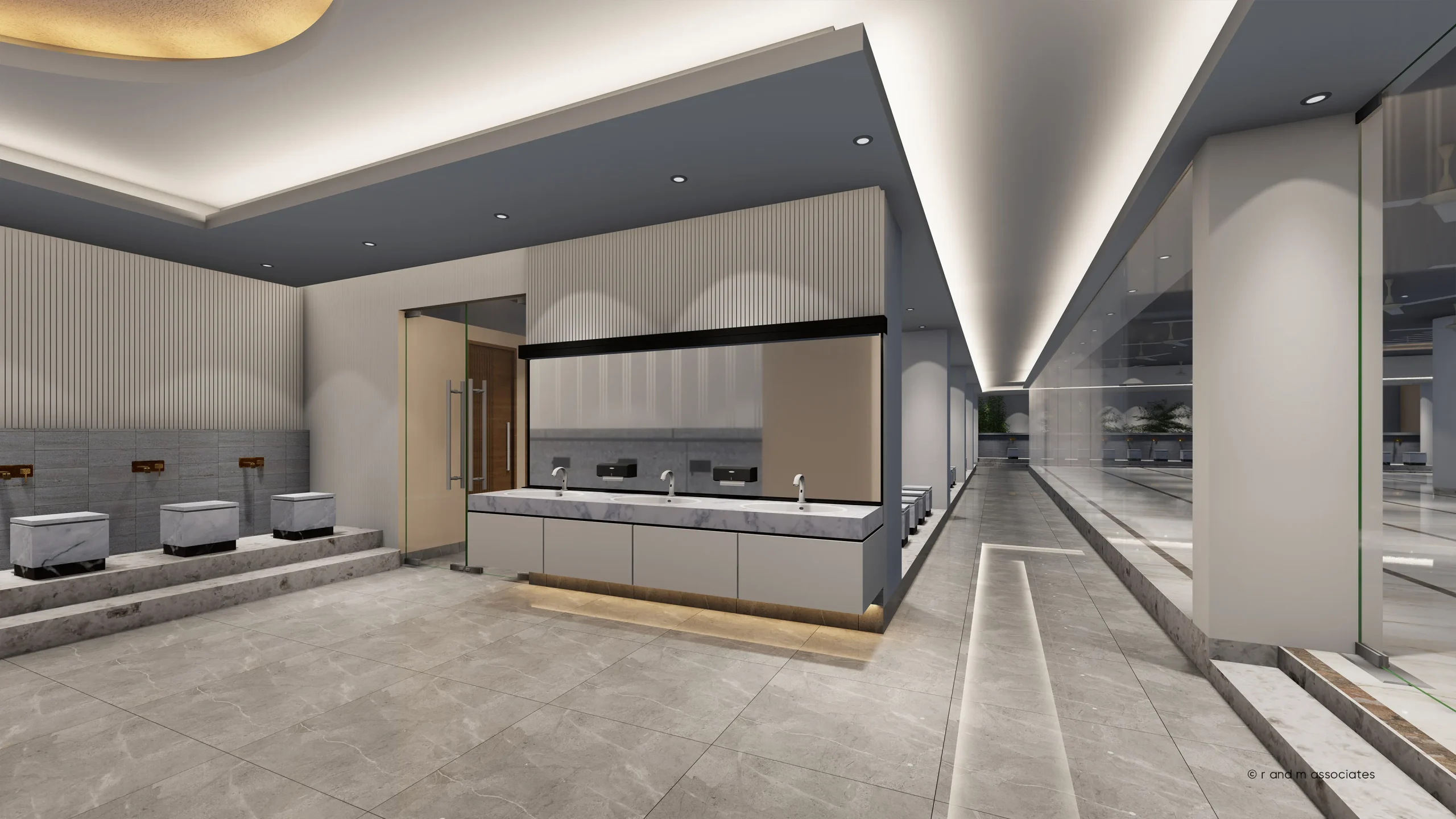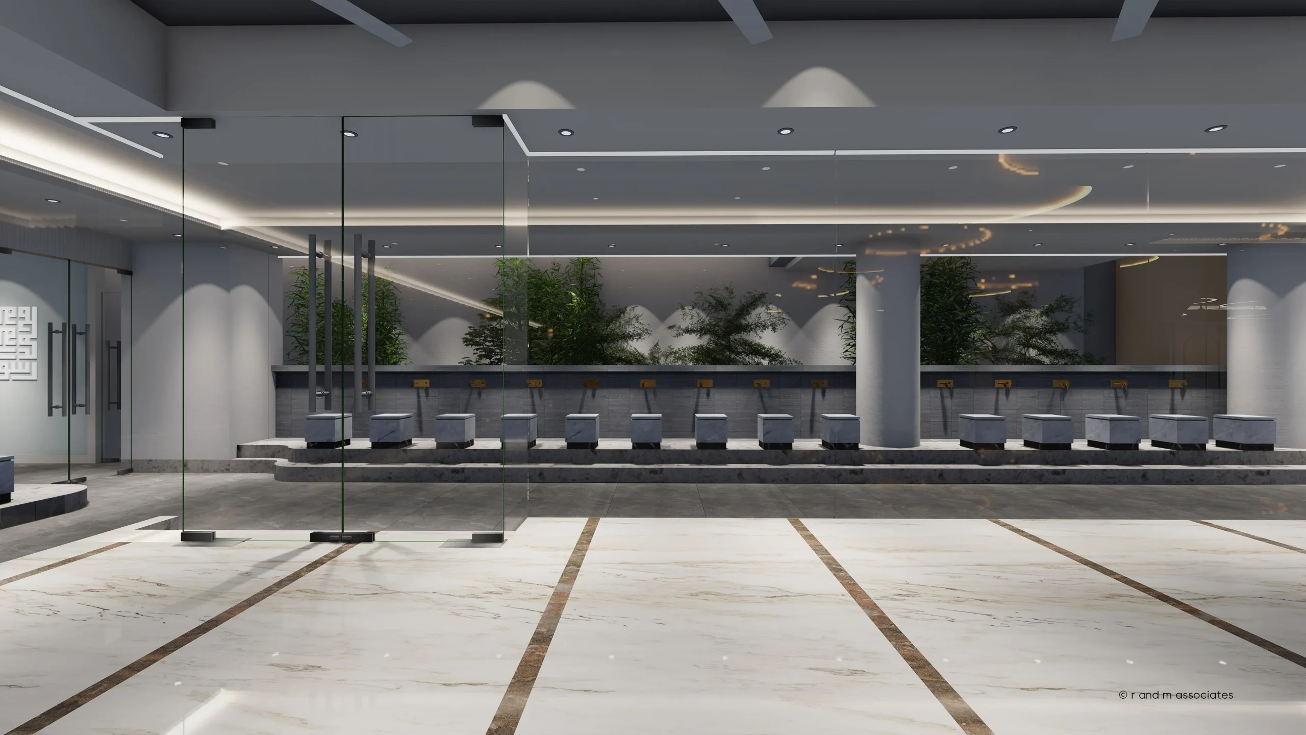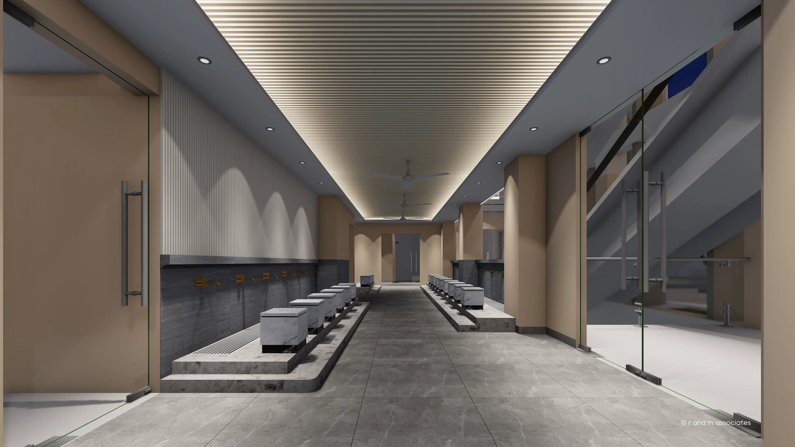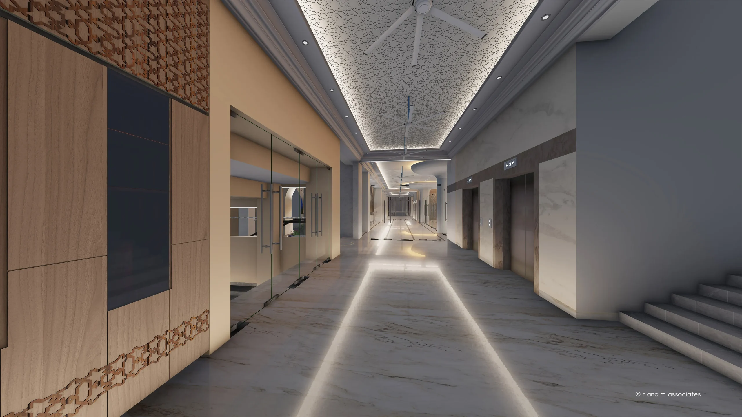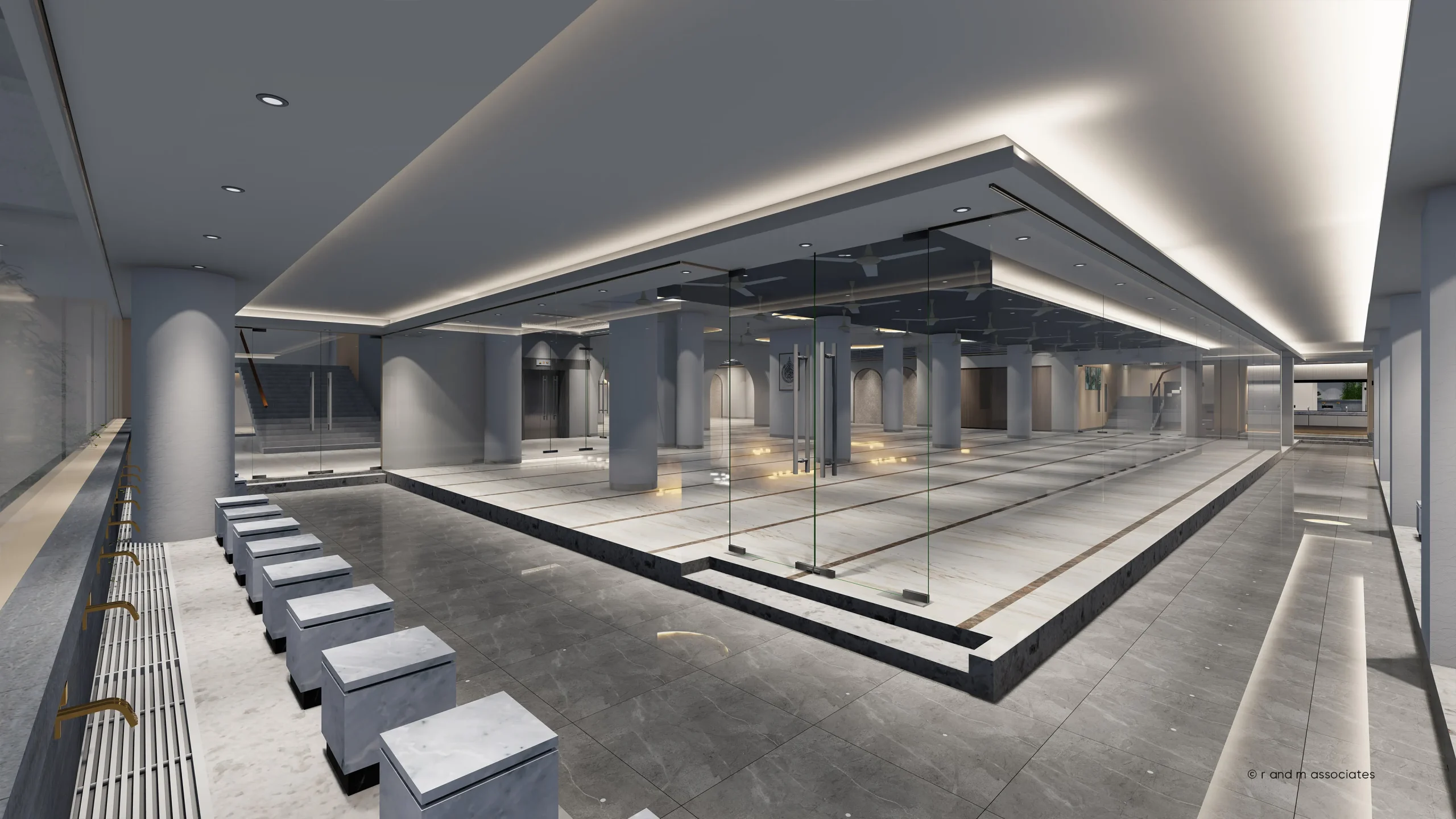 Uttara 7 No. Sector Jam-e-Masjid in Uttara, Dhaka is conceived as a contemporary sacred interior that balances monumentality with calm precision. The architectural concept emphasizes symmetry, axial order, and vertical clarity, guiding worshippers toward the mihrab as the spiritual anchor. Strong columnar forms and layered wall compositions define the spatial rhythm. A restrained palette of soft greys, ivory, and warm wood tones creates a serene, dignified atmosphere. Lighting is carefully layered with recessed fixtures, cove lighting, and circular pendant elements that enhance depth without distraction. Materials such as polished marble flooring, textured stone walls, perforated panels, and timber accents introduce tactile richness. The interior design merges modern detailing with Islamic geometry, resulting in a refined, timeless, and spiritually uplifting aesthetic.