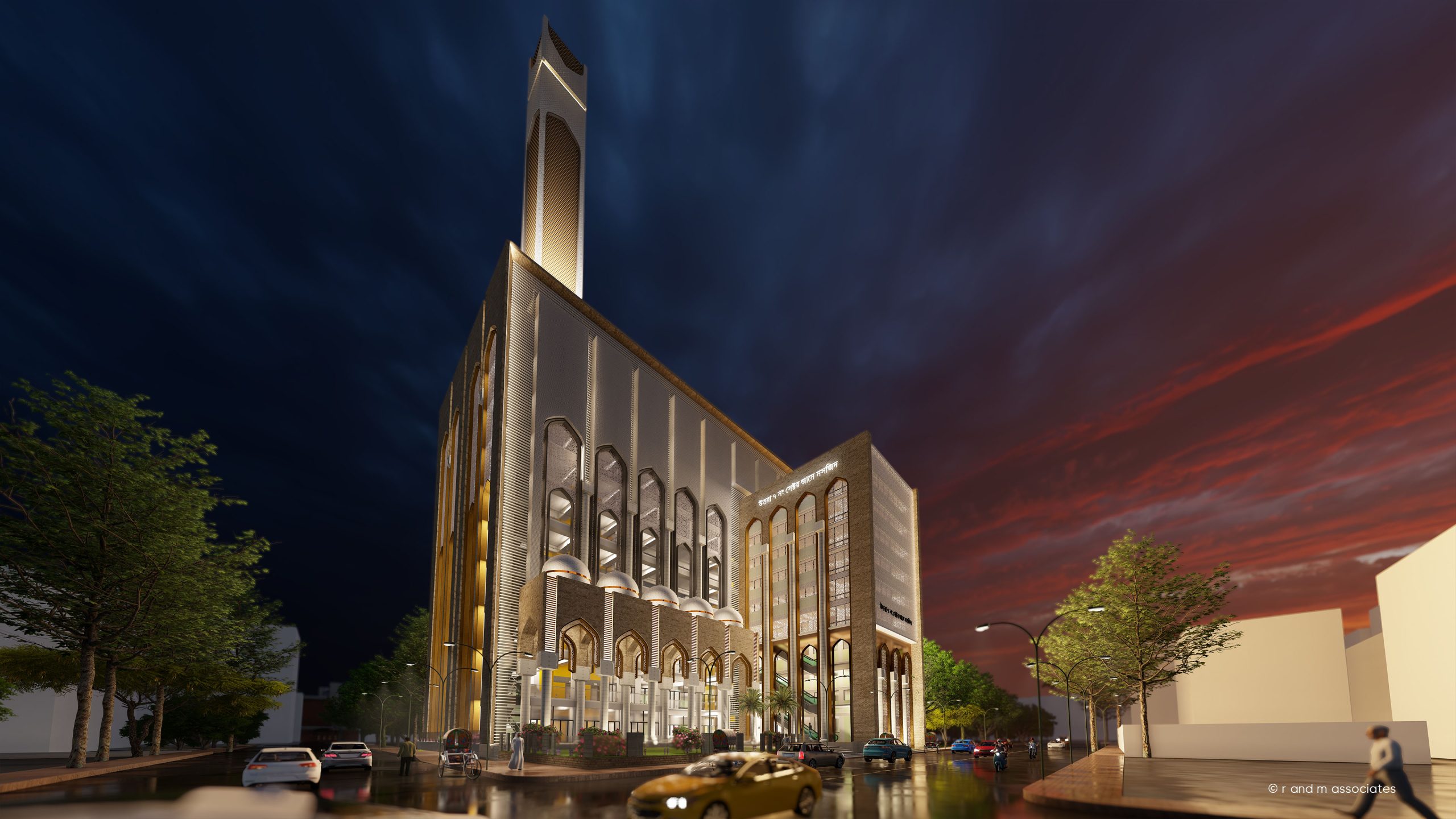 The design features strong vertical masses anchored by a slender minaret symbolizing spiritual ascension. Layered volumes carefully organize the main prayer halls and community spaces. The façade incorporates repetitive arches, perforated screens, and recessed openings to create depth, shade, and rhythm in the streetscape. Subtle domes define sacred zones, while light stone-toned finishes enhance the building’s serene and dignified character.
